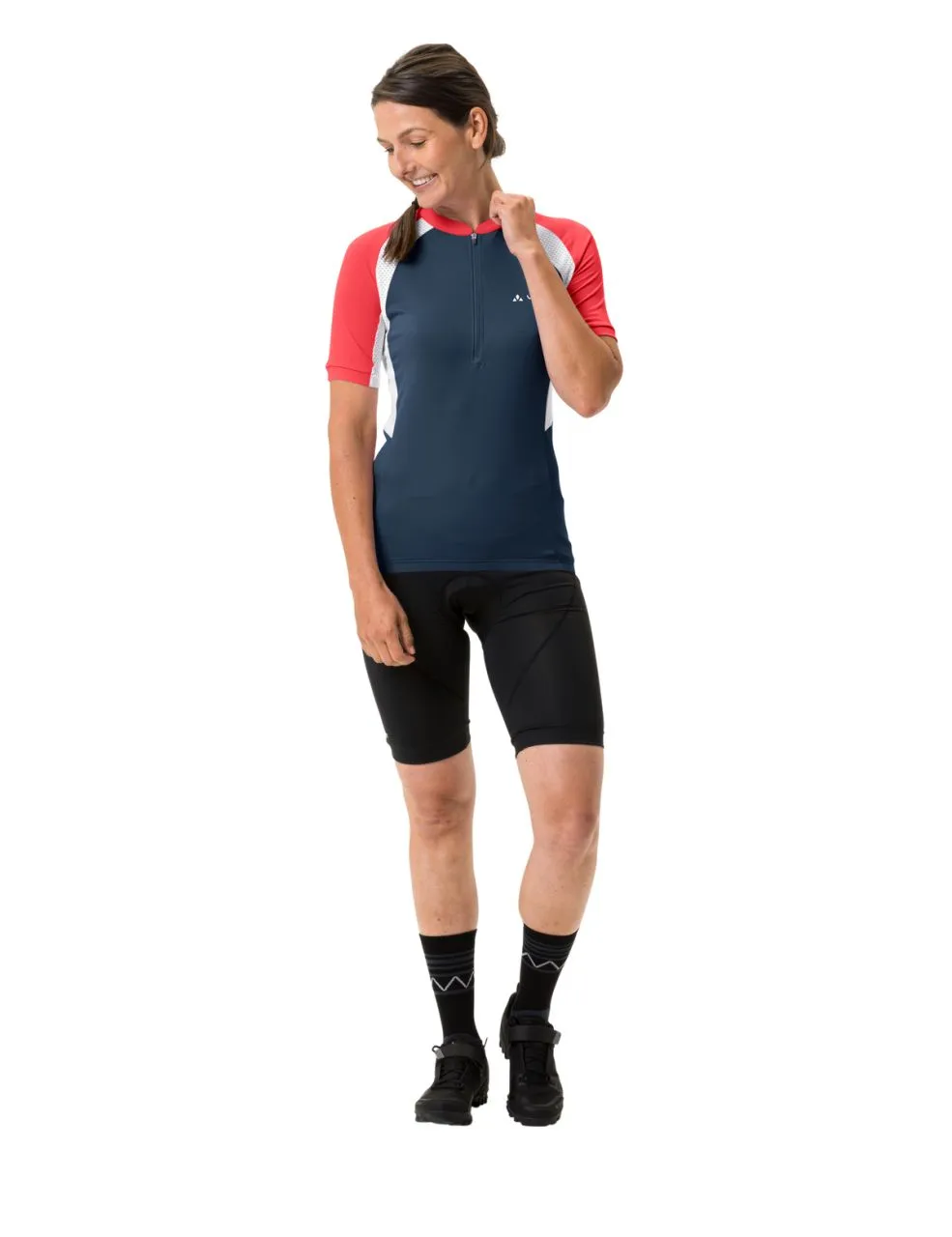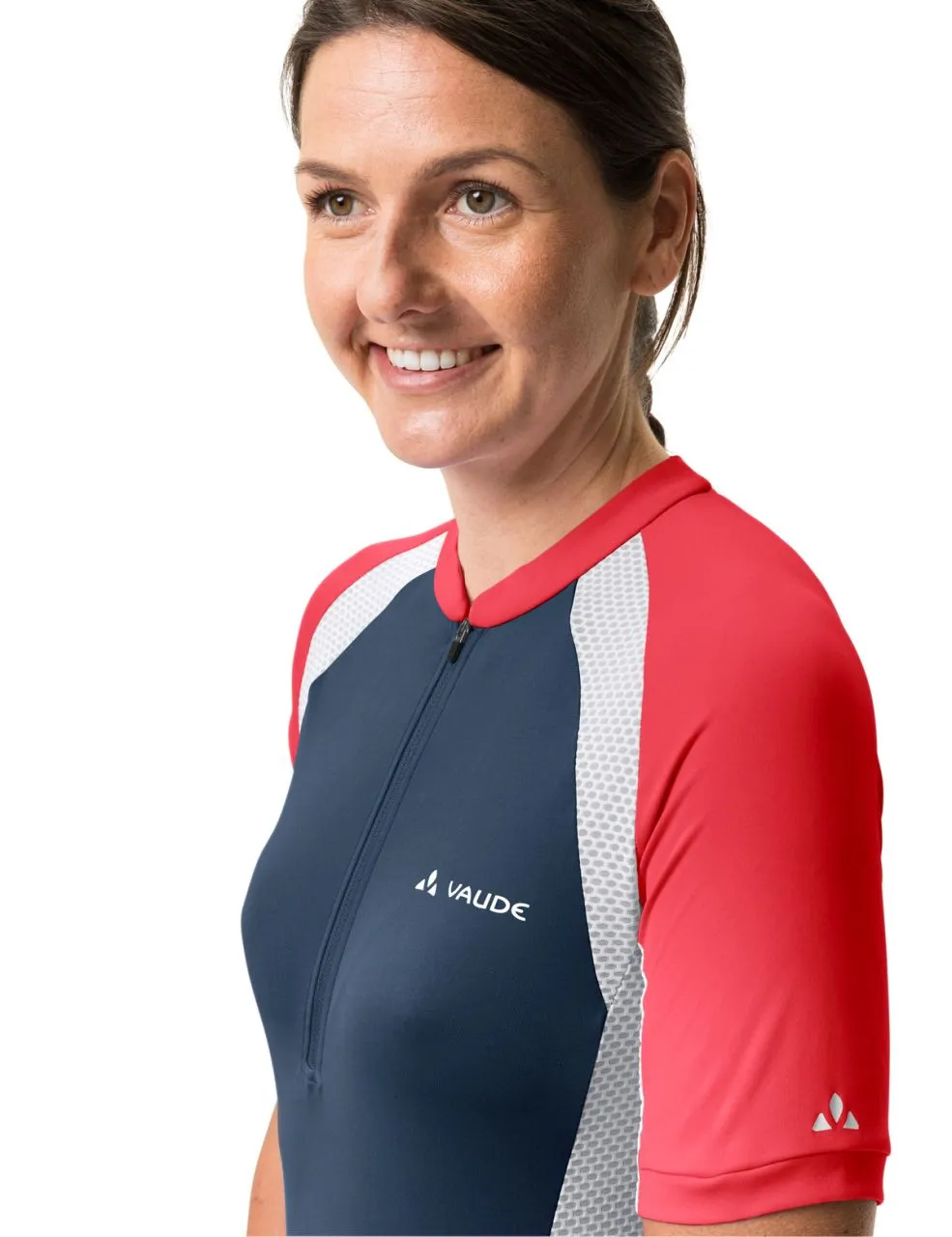 En forme en toutes circonstances. Ce maillot est conçu pour les hommes endurants.Le maillot de vélo performance au look moderne est doté d’un col montant et d’un zip. Son matériau fonctionnel léger et respirant et ses empiècements en maille sous le bras assurent un confort optimal, que tu sois un adepte des sorties courtes ou longues. Ton vêtement de pluie, une barre énergétique ou des objets de valeur se rangent facilement dans les trois poches arrière. Le label Green Shape de VAUDE garantit un produit écologique, fonctionnel et fabriqué dans des matériaux durables.