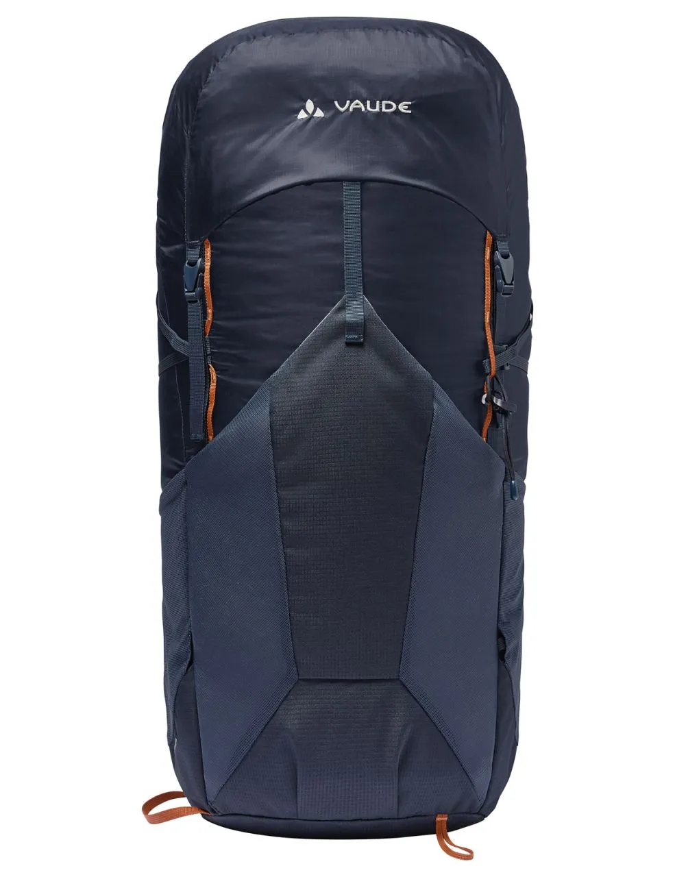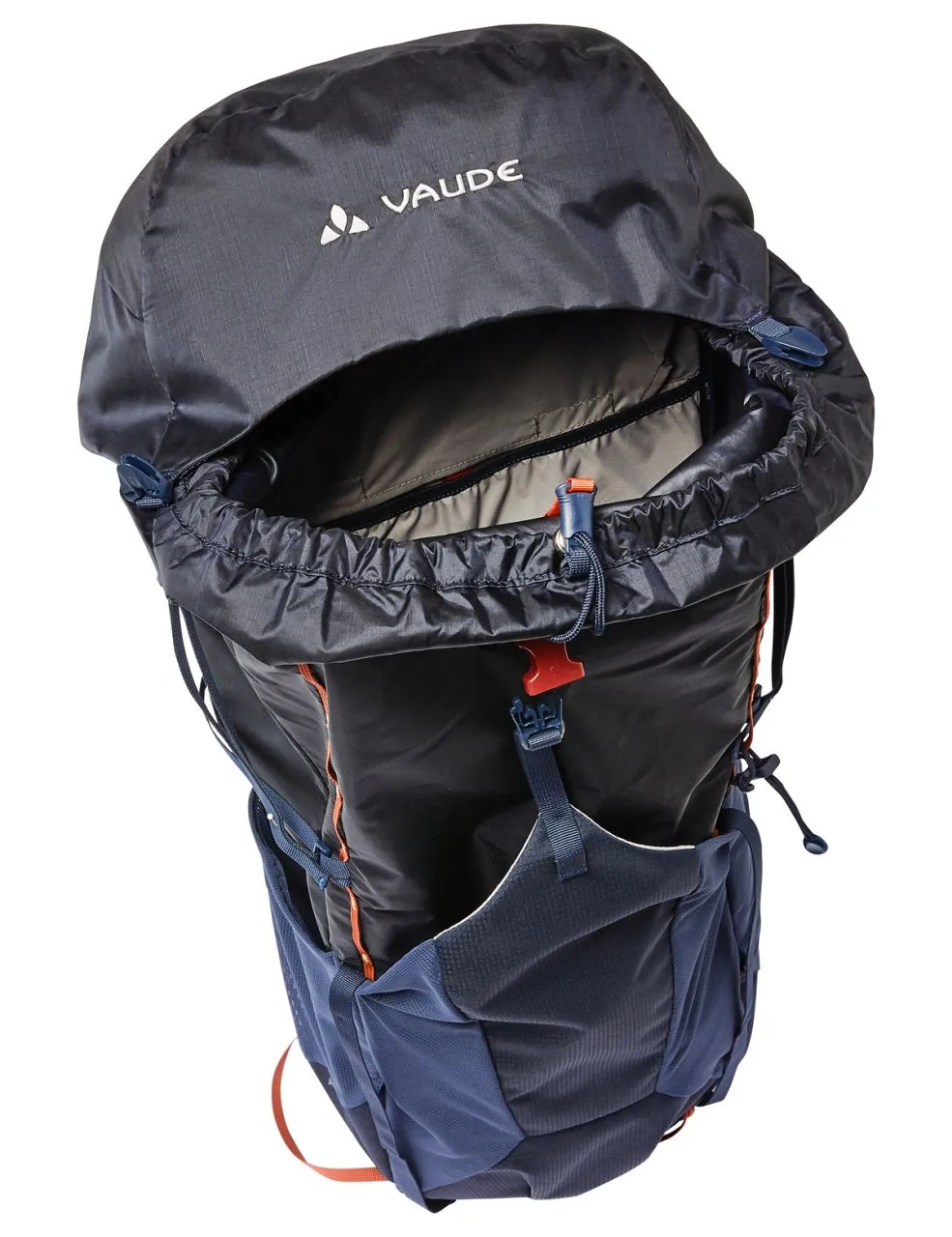 Quand chaque gramme fait son poids en trekking : le sac à dos de trekking léger offre un confort de portage élevé pour un poids minime – idéal pour les randonnées rapides et le pèlerinage. Le sac à dos de trekking ultraléger est rembourré pour soulager le dos : l’évidement au bas du dos atténue la pression sur l’articulation sacro-iliaque et prévient les douleurs dorsales. La charge est répartie de manière optimale avec Tergolight Comfort Space. Il est possible d’ajuster la longueur de dos ainsi que le rappel de charge. Les bretelles aériennes Ergoshape du Ahead 48+ offrent suffisamment de liberté aux bras lors des ascensions abruptes grâce à leur forme spéciale. Une barre énergétique ou un mobile peuvent rester à portée de main dans les poches placées sur les bretelles et la ceinture ventrale. Une gourde, un bonnet, etc. peuvent être retirés des poches latérales élastiques sans poser le sac. Des bâtons peuvent être fixés tout en marchant. L’équipement humide peut être stocké dans le compartiment frontal spacieux pour y sécher grâce aux empiècements en mesh. La daisy chain variable permet d’emporter un casque et des crampons. Le sac à dos avec chargement par le haut possède un compartiment spécial pour la poche d’hydratation. La boucle de rechange sur la sangle supérieure peut remplacer des boucles brisées en cours de route. Le capot réglable en hauteur et amovible élargit le volume à 8 l et peut se porter en plus comme un sac banane. Le matériau du Ahead 48+ est composé d’un mélange de polyester 100 % recyclé et de polyamide avec une teneur biosourcée de 62 % d’huile de ricin – un matériau ultra léger, résistant et durable. Le label Green Shape de VAUDE garantit un produit écologique et fonctionnel fabriqué dans des matériaux durables certifiés bluesign®.