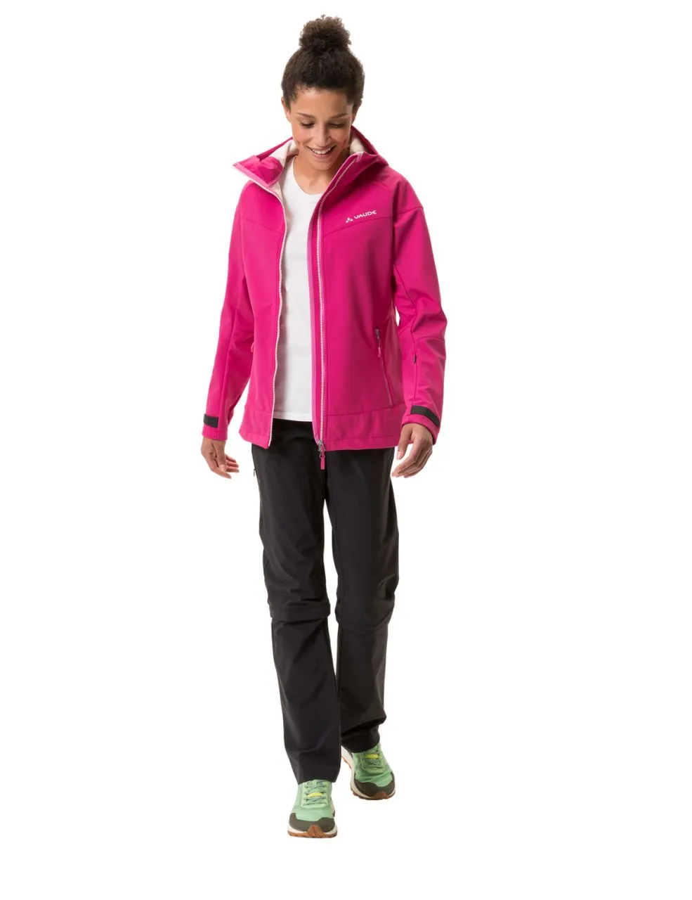 Dédiée aux randonneuses chevronnées : qui se promène volontiers par monts et par vaux trouvera dans cette veste softshell élastique avec une face extérieure partiellement gaufrée une tenue fonctionnelle et fiable pour toute l’année. La matière softshell repousse à 100 % les rafales de vent au sommet ou lors des soirées estivales plus fraiches grâce à sa membrane. La ventilation sous les bras part des aisselles jusqu’au dos et favorise la régulation thermique du corps même lors des sorties en montagnes physiques. La fermeture à glissière frontale bidirectionnelle permet d’accéder sans difficulté et à tout moment aux poches du pantalon. La capuche épouse la tête de manière optimale et peut se régler confortablement d’une seule main. Les poignets peuvent aussi être ajustés par un velcro. Le col montant haut et la face intérieure légèrement grattée font de cette veste softshell une tenue agréablement douce pour la mi-saison ainsi qu’en été dans les alpages. La veste softshell est fabriquée à 100 % en matériaux recyclés. Le label Green Shape de VAUDE garantit un produit écologique, fonctionnel et fabriqué dans des matériaux durables certifiés bluesign®.