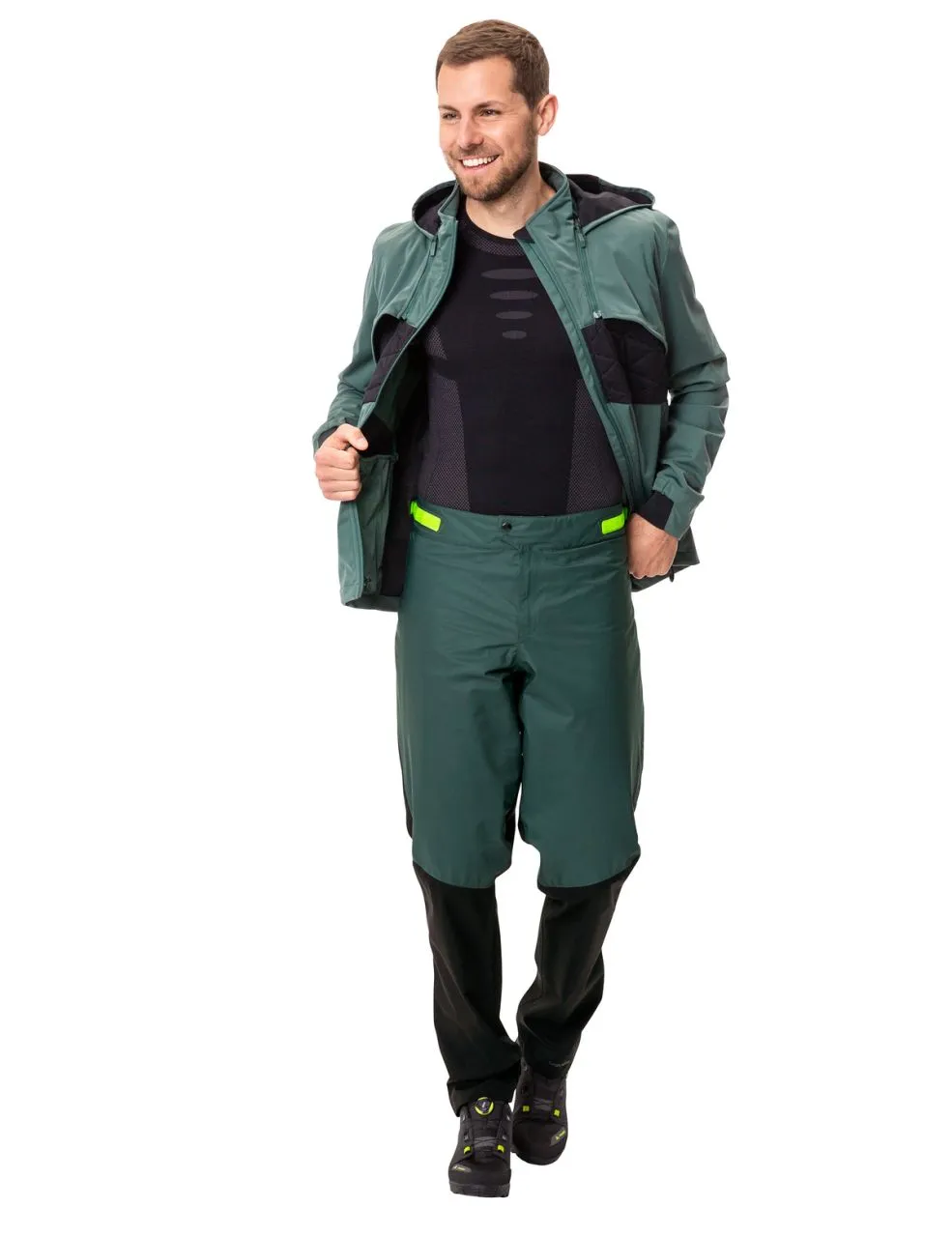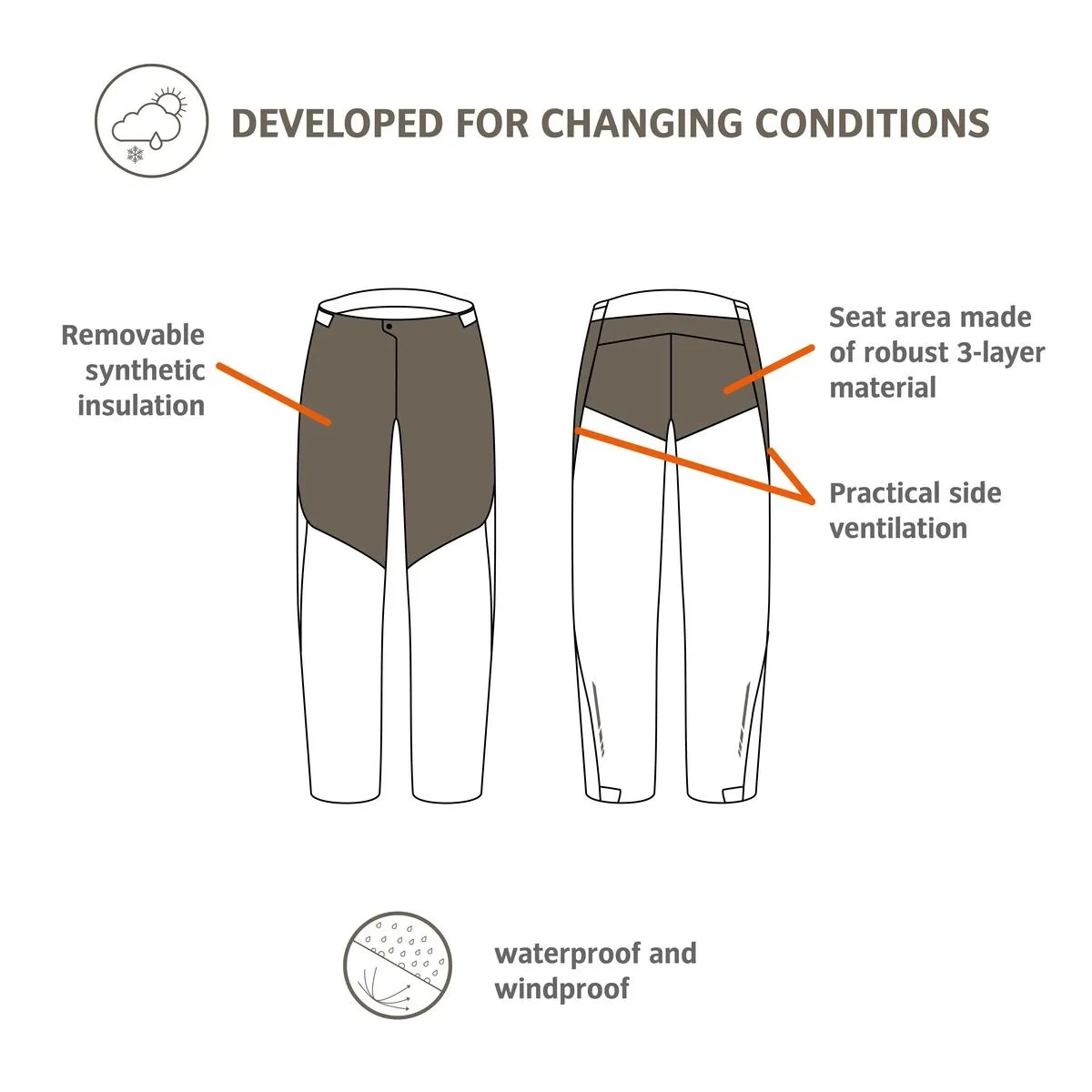 Pantalon de pluie décontracté et très variable pour circuits VTT ! Le pantalon est spécialement conçu pour les vététistes actifs qui veulent encore se lancer sur les pistes en soirée ou entreprendre des virées allongées entre amis le week-end. Cet artiste transformiste évolue en fonction de différentes plages de températures. Le pantalon de pluie robuste apporte une protection contre la pluie très légère et compressible en été, qui est également appréciée par les navetteurs. Un empiècement chauffant au rembourrage à base de S.Cafe® peut être zippé sous la ceinture pour affronter les températures plus basses au printemps et en automne. Le rembourrage s’étend de la cuisse à la ligne de coupe au-dessus du genou préformé. La matière extérieure du pantalon de pluie renforcé au fessier est très robuste, étanche à l’eau et au vent. Les zips d’aération s’étendent de la hanche au genou et sont renforcés de mesh. L’ouverture réglable par velcro est située à l’arrière taillé plus haut de la ceinture agréablement douce. Grâce à sa coupe volontairement généreuse Regular Fit, le pantalon de pluie peut s’enfiler au-dessus d’un short VTT avec cuissard, mais convient aussi très bien au-dessus de jeans portés en navette domicile-travail ! Cet artiste de la transformation est parfaitement assorti à la veste de pluie All Year Moab 3in1 Rain Jacket et bénéficie de la certification selon la norme environnementale la plus stricte bluesign®. Le label Green Shape de VAUDE garantit un produit écologique, fonctionnel et fabriqué dans des matériaux durables.