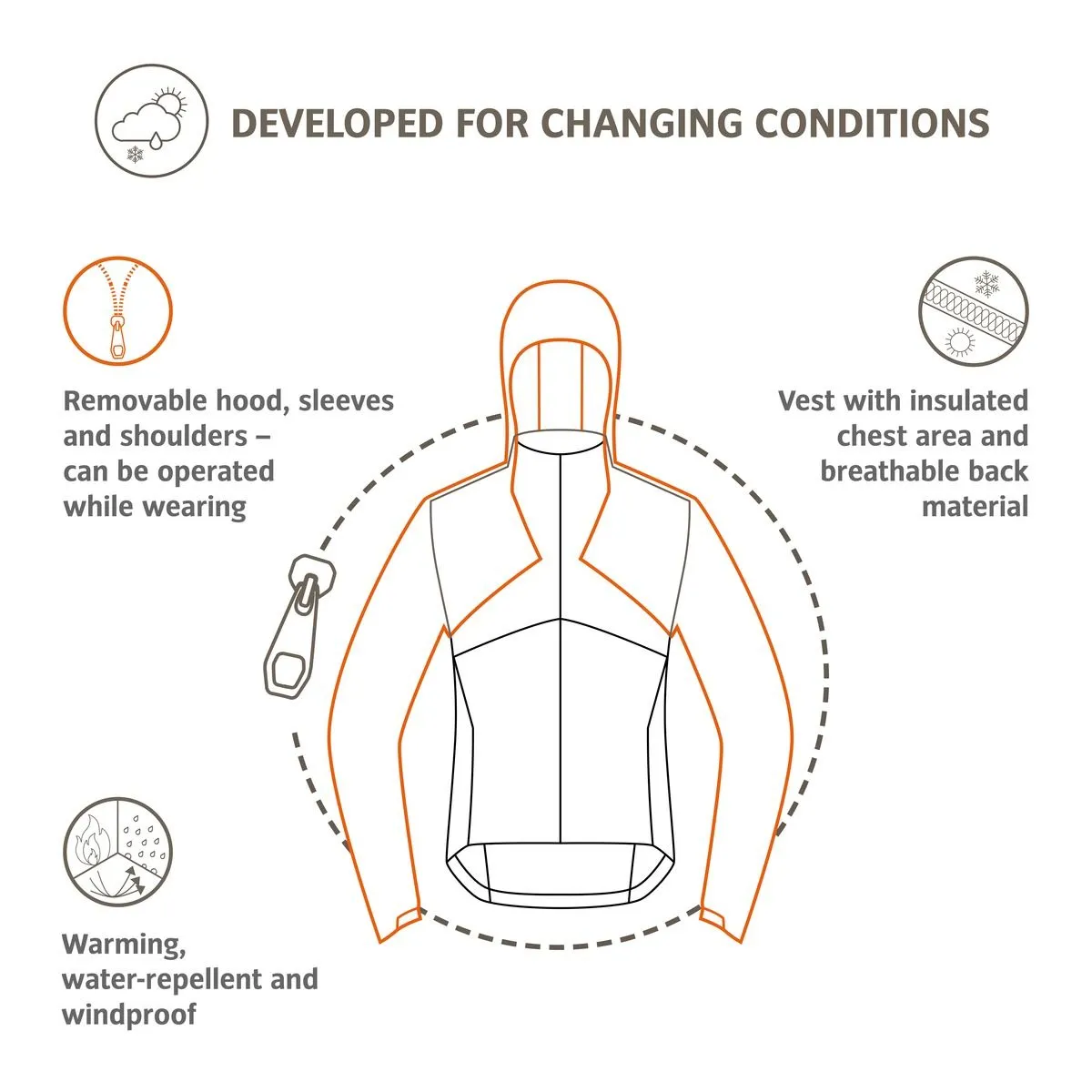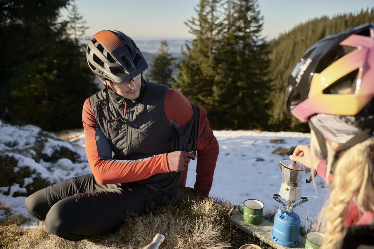 Notre champion de la transformation ! Une tenue imperméable efficace est la condition essentielle à la pratique du VTT sans souci, particulièrement à la mi-saison. Avec cette veste softshell hybride réversible agrémentée d’un rembourrage léger, VAUDE lance une exclusivité sur le marché. L’ensemble réchauffe le corps dans la fraicheur matinale ; quand le mercure se met à monter, le complément élégamment intégré au design peut être aisément dézippé en dessous du col et rangé dans le sac à dos. Un gilet apporte désormais la chaleur nécessaire. Quand la fraicheur ressurgit en soirée, le complément peut être à nouveau zippé tout aussi rapidement. La capuche apporte un complément de chaleur appréciable lors des pauses en montagne. La matière softshell coupe-vent S.Cafe® est composée de polyester recyclé et assemblé point par point avec le rembourrage S.Cafe® sur la poitrine grâce à une technologie haute fréquence. Ceci permet d’éviter les perforations qui pourraient générer des ponts thermiques. L’empiècement élastique dans le dos assure une bonne respirabilité. La veste se présente dans une coupe sportive avec des manches préformées, 2 poches zippées à l’avant et des poignets ajustés. Grâce à ses possibilités d’utilisation variées, la veste All Year Moab ZO Jacket se prête aussi bien au cyclotourisme en automne, aux déplacements domicile-travail ou à la randonnée. Elle est parfaitement assortie au pantalon Men’s All Year Moab ZO Pants II et bénéficie de la certification selon la norme environnementale la plus stricte bluesign®. Le label Green Shape de VAUDE garantit un produit écologique, fonctionnel et fabriqué dans des matériaux durables.