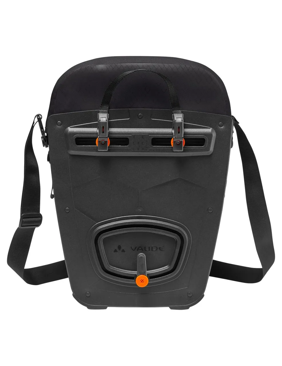Les sacoches de vélo pour cycliste respectueux du climat : Aqua Back Pro est fabriquée en matériau entièrement recyclé, robuste et sans PVC sur le site allemand de VAUDE à Tettnang et accompagne de nombreuses virées à vélo pendant de longues années. Le matériau avant est composé de polyamide recyclé ; les parois latérales sont composées de polyamide recyclé. La sacoche est pourvue d’éléments réfléchissants imprimés, absolument imperméable et peut s’ouvrir et se fermer rapidement grâce à la fermeture à rabat. Une sacoche interne supplémentaire assure une meilleure organisation et l’espace de rangement de 24 l de volume par sacoche est suffisant. La plaque dorsale écologique est entièrement composée de matériau recyclé. Une méthode innovante de recyclage permet d’obtenir ici une nouvelle matière première durable. La plaque dorsale ultra stable ainsi fabriquée est munie d’un système QMR 2.0 de manipulation aisée afin de fixer et de retirer la sacoche d’un seul geste. La fixation est ajustable grâce à des molettes aisément manipulables et s’adapte ainsi à tout porte-bagages jusqu’à 16 mm de diamètre de tube. Les sacoches peuvent être verrouillées sur le vélo avec le système de fixation QMR 2.0 (avec p. ex. un cadenas Abus 145/10, non compris dans la livraison). Le label Green Shape de VAUDE garantit un produit écologique, fonctionnel et fabriqué dans des matériaux durables. Ce produit est de plus climatiquement neutre : les émissions issues des matériaux, des processus de fabrication et du transport ont été déterminées de manière holistique et systématiquement réduites. Les émissions actuellement inévitables ont été entièrement compensées par l’organisation indépendante à but non lucratif « myclimate ». Compris dans la livraison : 1 paire de sacoches