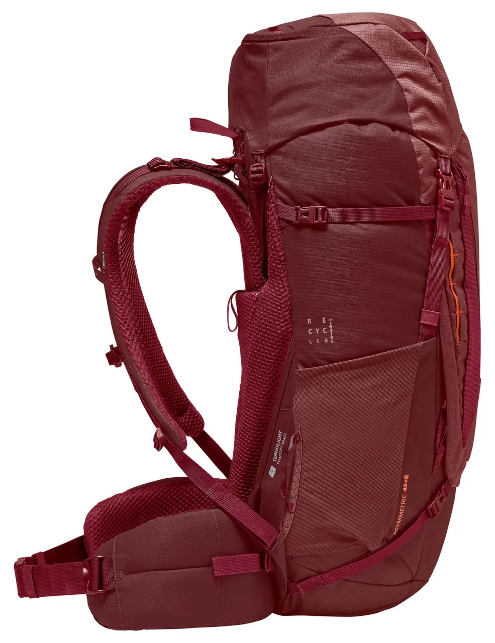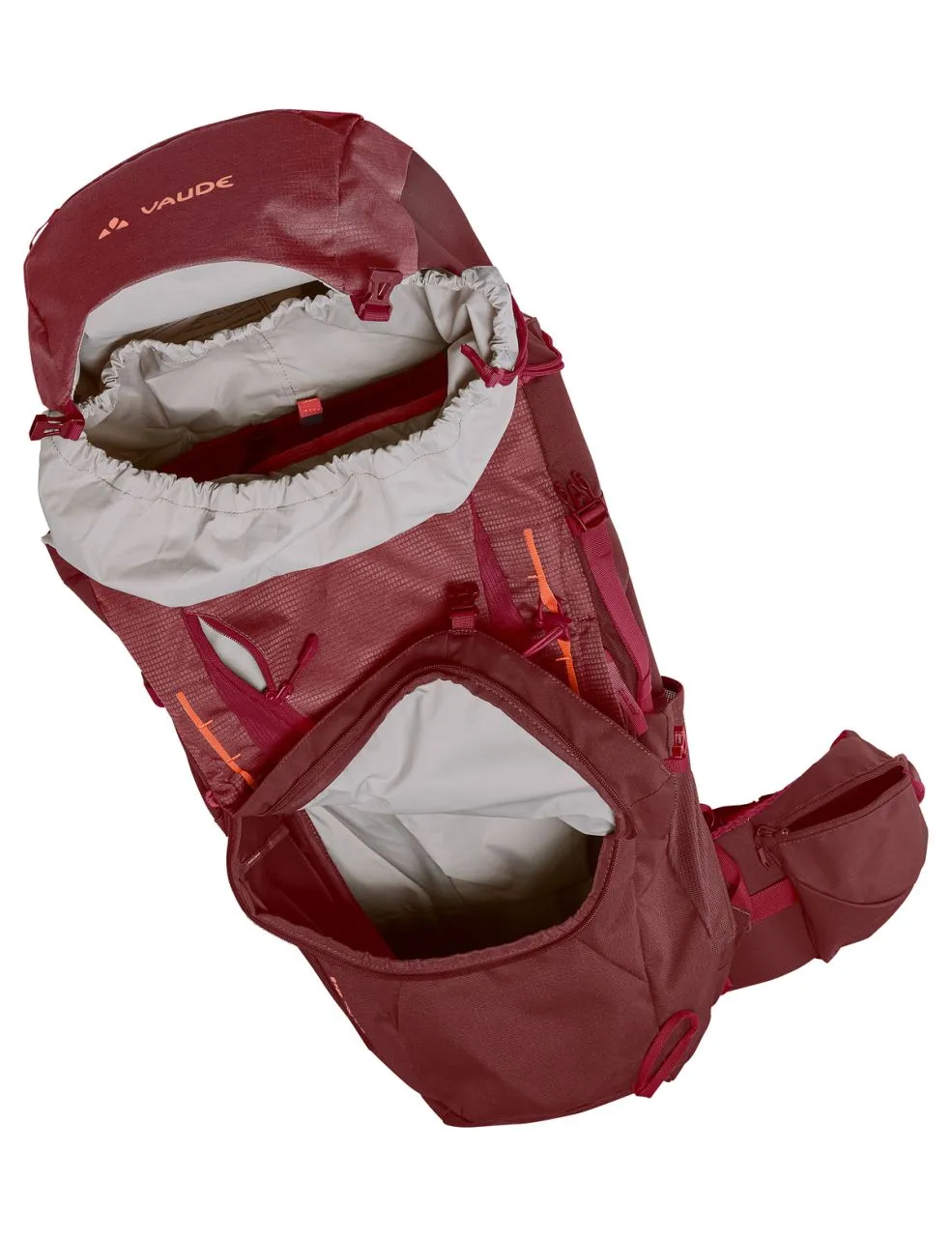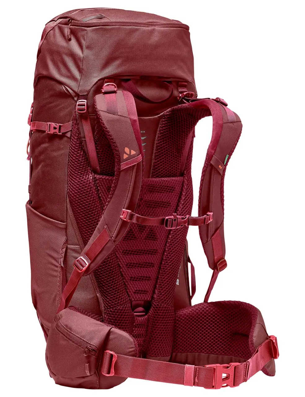 Préparer son sac à dos pour le prochain circuit de refuge en refuge ! Avec ses 48 l, le sac à dos de trekking femme convient parfaitement aux circuits de trekking courts, pour le trekking alpin, le pèlerinage et le backpacking. Même en cas de charges lourdes, le système Tergolight Comfort Space assure un confort de portage élevé : l’évidement entre les rembourrages dorsaux du bas permet de délester l’articulation sacro-iliaque et de soulager ainsi le bas du dos. La longueur du dos et le rappel de charge se règlent individuellement. Le sac à dos de trekking est ergonomique et conçu pour la randonneuse chevronnée : il englobe une partie dorsale raccourcie, des bretelles plus courtes et une ceinture ventrale rembourrée douce et préformée. Le compartimentage est tout aussi pratique : car il est accessible par le haut et par l’avant. Tout ce qui doit rester à portée de main peut se ranger dans le compartiment frontal élastique et un fond séparable permet de cloisonner le linge sale du propre. Une gourde, une caméra ou un bonnet sont accessibles d’un geste grâce aux compartiments latéraux élastiques, sans poser le sac. Des crampons, un casque et des bâtons peuvent venir se fixer sur la daisy chain ou sur la sangle à matériel supplémentaire – pour affronter tous les types de terrain ! Des sangles de compression pratiques sont apposées sur les côtés du sac à dos ainsi que sous le capot. La boucle intégrée dans la sangle supérieure sert également de rechange en cas de casse sur la route. Le capot réglable en hauteur permet d’élargir la contenance du sac à dos. Le sac à dos de trekking pour femme est principalement composé de matériaux recyclés. Le label Green Shape de VAUDE garantit un produit écologique, fonctionnel et fabriqué dans des matériaux durables certifiés bluesign®.