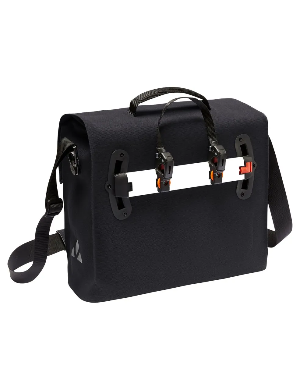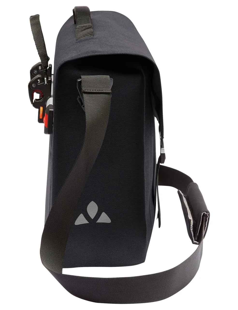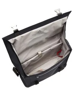 La serviette porte-documents pour le vélo. La sacoche pour roue arrière de taille moyenne Bayreuth M au format serviette porte-documents est fabriquée dans un matériau polyamide à l’aspect textile avec jointures étanches et entièrement sans PVC. L’ordinateur portable 13″ est bien protégé dans le compartiment rembourré à côté de documents A4 rangés dans le compartiment principal. Le matériau intérieur clair assure une bonne visibilité : un porte-clés, un compartiment pour mobile rembourré, un porte-crayons et une boucle pour insérer une gourde complètent l’équipement intérieur. Le sac s’installe et se retire du porte-bagages (jusqu’à un diamètre de 16 mm) à l’aide du rail de fixation Plug and Ride réglable. L’opération s’effectue simplement à la main. Un petit cadenas de vélo (p. ex. VAUDE TSA Combination Lock II, non compris dans la livraison) permet de verrouiller la sacoche directement sur le crochet QMR. Les petits pieds au sol garantissent une bonne stabilité, et la sacoche se transporte aisément à pied avec ses poignées ou sa bandoulière bien rembourrée. Les éléments réfléchissants sur l’avant et aux côté renforcent la visibilité. La sacoche de vélo est confectionnée dans une approche climatiquement neutre au siège de VAUDE en Allemagne du Sud selon une technique de haute fréquence, revendique un design épuré et une qualité haut de gamme Made in Germany. Les émissions issues des matériaux, de la fabrication et du transport ont été déterminées de manière holistique et systématiquement réduites. Les émissions actuellement inévitables sont compensées par l’organisation indépendante à but non lucratif « myclimate ».
