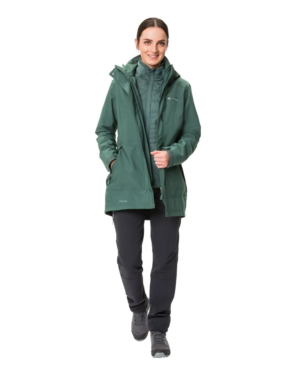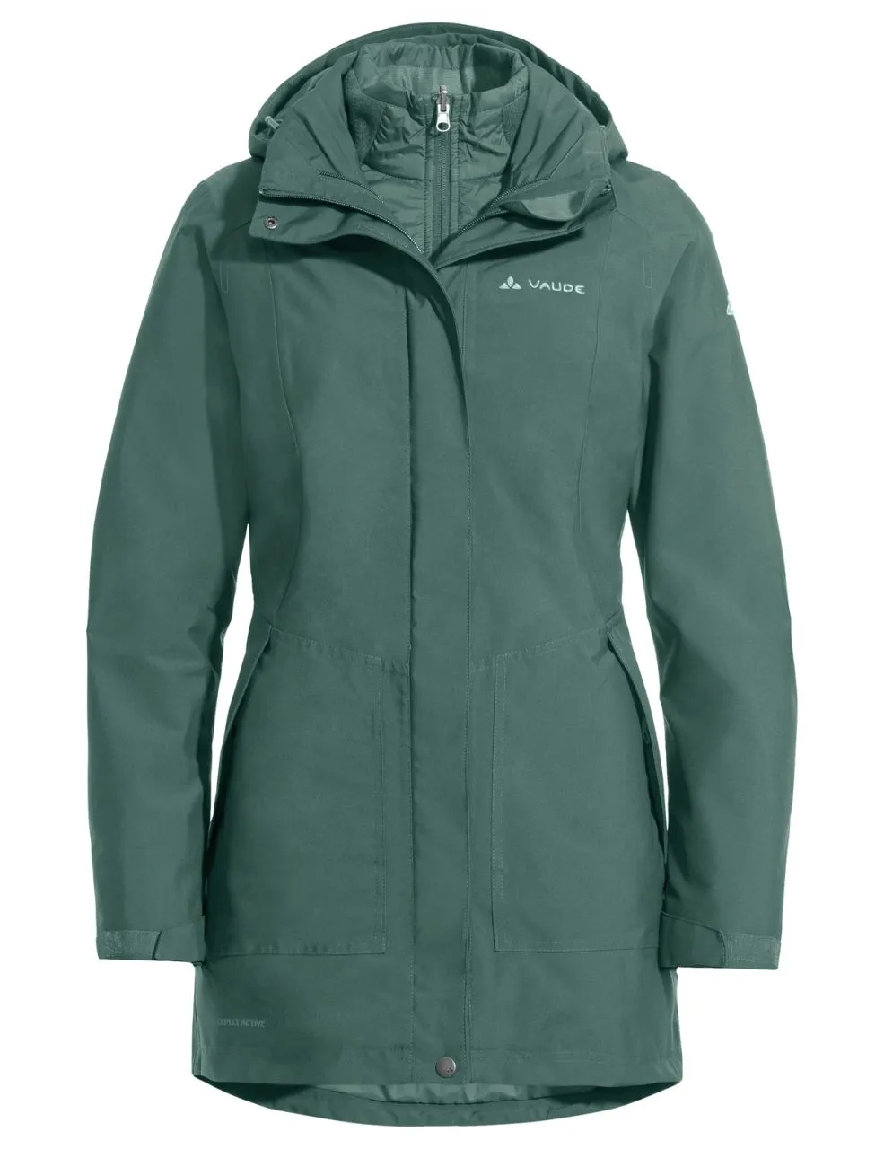 Bien protégé à travers la saison froide : parka d’hiver femme 3 en 1 chaude, tendance et écologique, entièrement étanche à l’eau et au vent grâce à sa membrane Ceplex respirante. La surveste munie de grandes poches en biais et d’une capuche amovible offre une protection imperméable complète, tandis que la veste intérieure sportive en mélange de matières apporte une chaleur agréable et produit un bel effet portée en solo. La polaire hybride sportive de la veste intérieure est composée d’un torse légèrement rembourré et de manches chaudes, douces et respirantes en polaire, ce qui assure une régulation thermique optimale et équilibrée lors des randonnées d’hiver. Elle est dotée en outre de deux poches en biais et d’un col montant chauffant. La parka peut se porter sans veste intérieure et couvre ainsi une large plage de températures. Ce produit est fabriqué en matériau recyclé et doté de la finition écologique et déperlante Eco Finish sans fluorocarbures (PFC). Le label Green Shape de VAUDE garantit un produit écologique, fonctionnel et fabriqué dans des matériaux durables certifiés bluesign®.