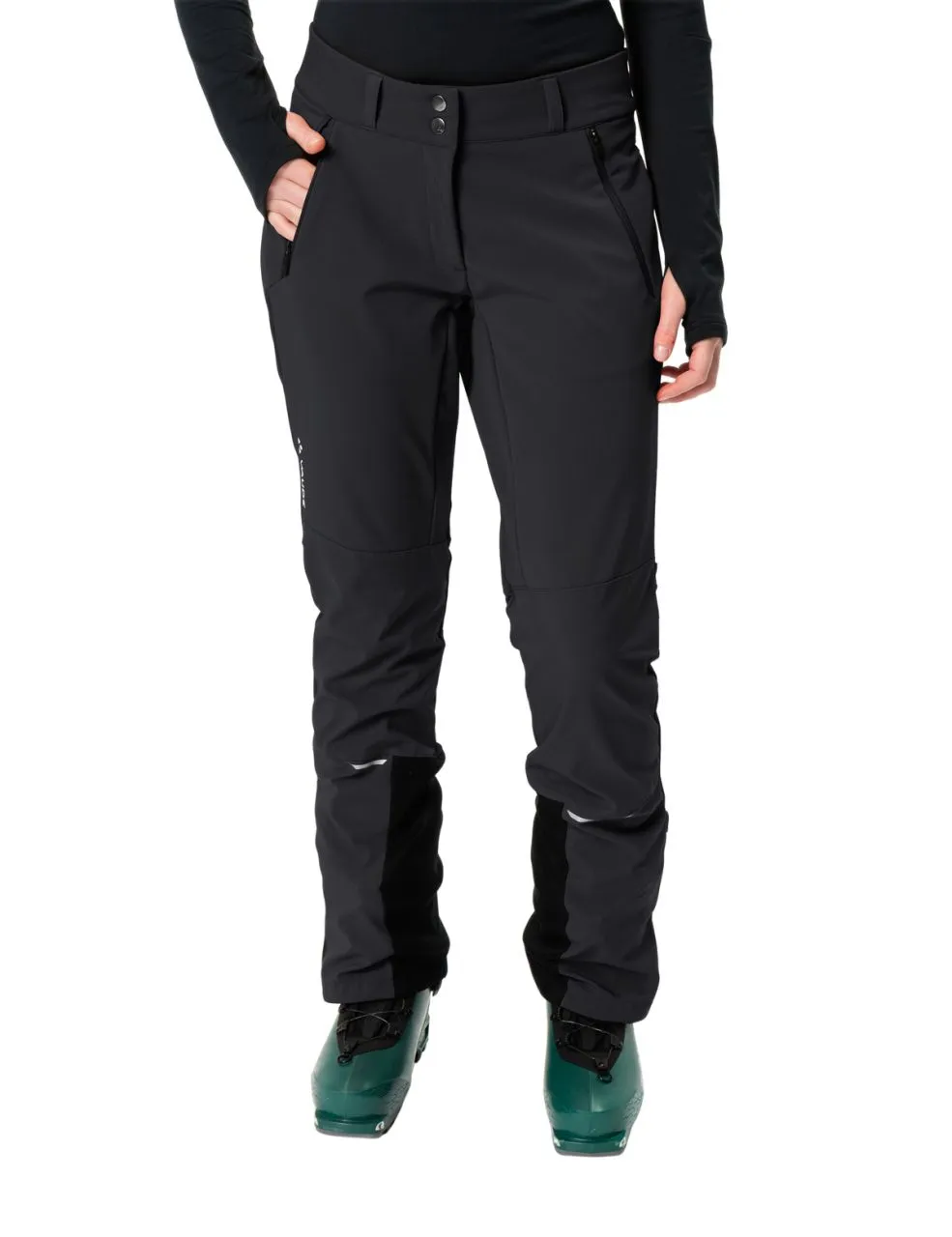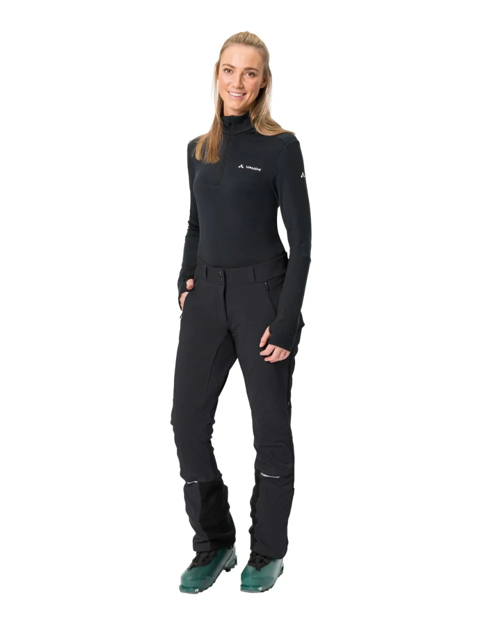 Idéal en montée : ce pantalon softshell femme près du corps pour le ski de randonnée sportif associe trois zones comprenant différents matériaux et assure un climat corporel optimal pour les sports de vitesse en hiver. Ce mélange de matières se compose d’un tissu softshell étanche au vent aux endroits les plus exposés au vent, d’une matière élastique et coupe-vent Windproof 80 pour les parties moins exposées, et d’une matière extrêmement respirante au niveau des pliures des genoux qui accompagne tous les mouvements à la perfection. Le pantalon de rando à ski pour femme est muni d’une ceinture haute et recouvre ainsi parfaitement le bas du dos. Des zips d’aération et des éléments réfléchissants décoratifs complètent ce pantalon softshell femme confortable. Le bas des jambes renforcé en stretch Cordura® résistant protège le pantalon des carres des skis et des crampons. Ce produit est apprêté avec la finition Eco Finish, déperlante, écologique et sans fluorocarbures (PFC). Le label Green Shape de VAUDE garantit un produit écologique, fonctionnel et fabriqué dans des matériaux durables. En tant que membre élevé au rang de Leader de l’organisme indépendant Fair Wear, VAUDE s’engage en faveur de conditions de travail et de salaires équitables. Ce produit est de plus climatiquement neutre : les émissions issues des matériaux, des processus de fabrication et du transport ont été déterminées de manière holistique et systématiquement réduites. Les émissions actuellement inévitables ont été entièrement compensées par l’organisation indépendante à but non lucratif « myclimate ».