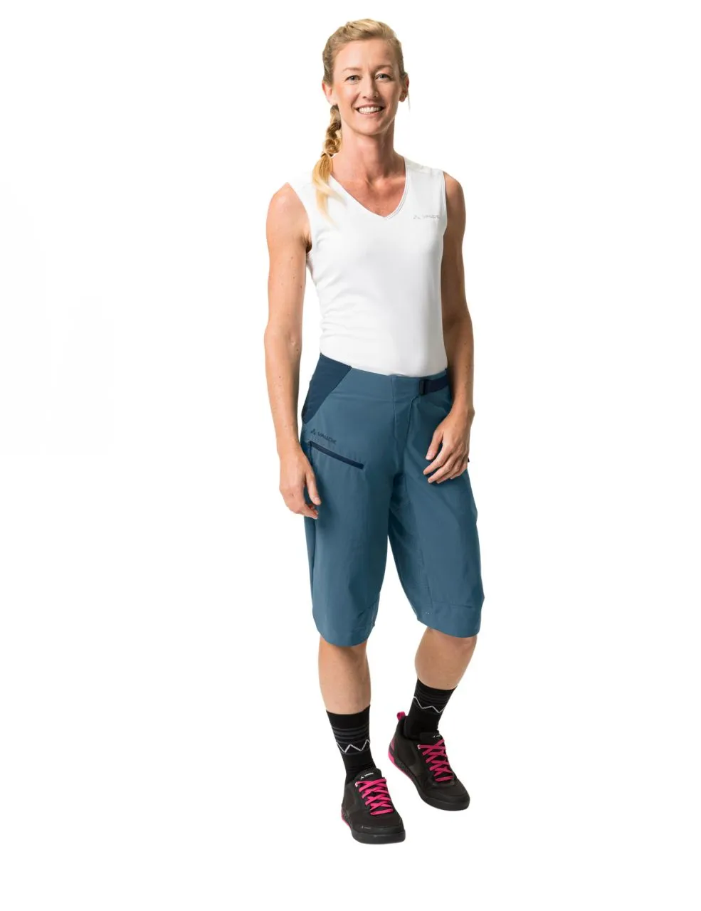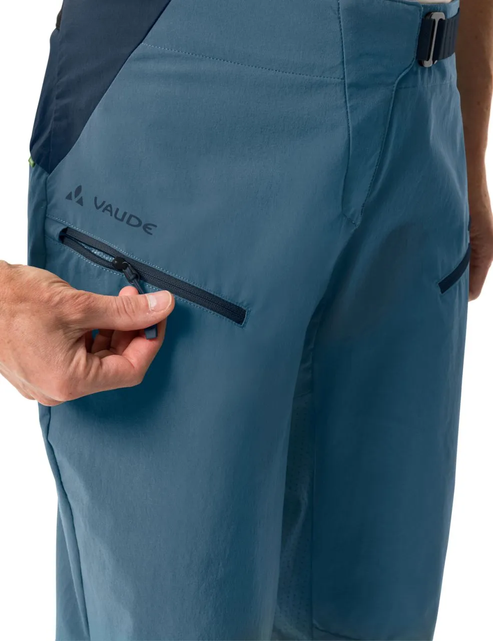 Rien ne s’oppose à l’action au bike park ou sur le trail avec le short sympa Moab Pro. Le short ultraconfortable VTT enduro pour femme est doté d’une ceinture 2 en 1 innovante et facile à ajuster, qui se passe entièrement d’un zip pour éviter les pressions et les pincements. La ceinture élastique est relevée à l’arrière pour que le short VTT enduro pour femme reste bien en place. La coupe progressive du genou préformé permet de rouler avec des protecteurs et les perforations à l’intérieur des jambes assurent une ventilation idéale. 2 poches en biais basses zippées sont accessibles en selle et assurent de plus une fonction de ventilation. Une méthode certifiée du bilan massique est appliquée au cours de la fabrication de la matière ultrarobuste, légère et très élastique à la fois. De l’huile de pyrolyse qui entre dans la fabrication du polyamide conventionnel est obtenue à partir de pneus usagés. Le recyclage chimique permet de réduire les émissions de CO2 de 60 %. Le short pour femme Moab Pro est doté de la finition déperlante et antisalissures Eco Finish sans PFC. Ce produit est de plus climatiquement neutre : les émissions issues des matériaux, de la fabrication et du transport ont été déterminées de manière holistique et systématiquement réduites. Les émissions actuellement inévitables sont compensées par l’organisation indépendante à but non lucratif « myclimate ». Le label Green Shape de VAUDE garantit un produit écologique, fonctionnel et fabriqué dans des matériaux durables certifiés bluesign®.