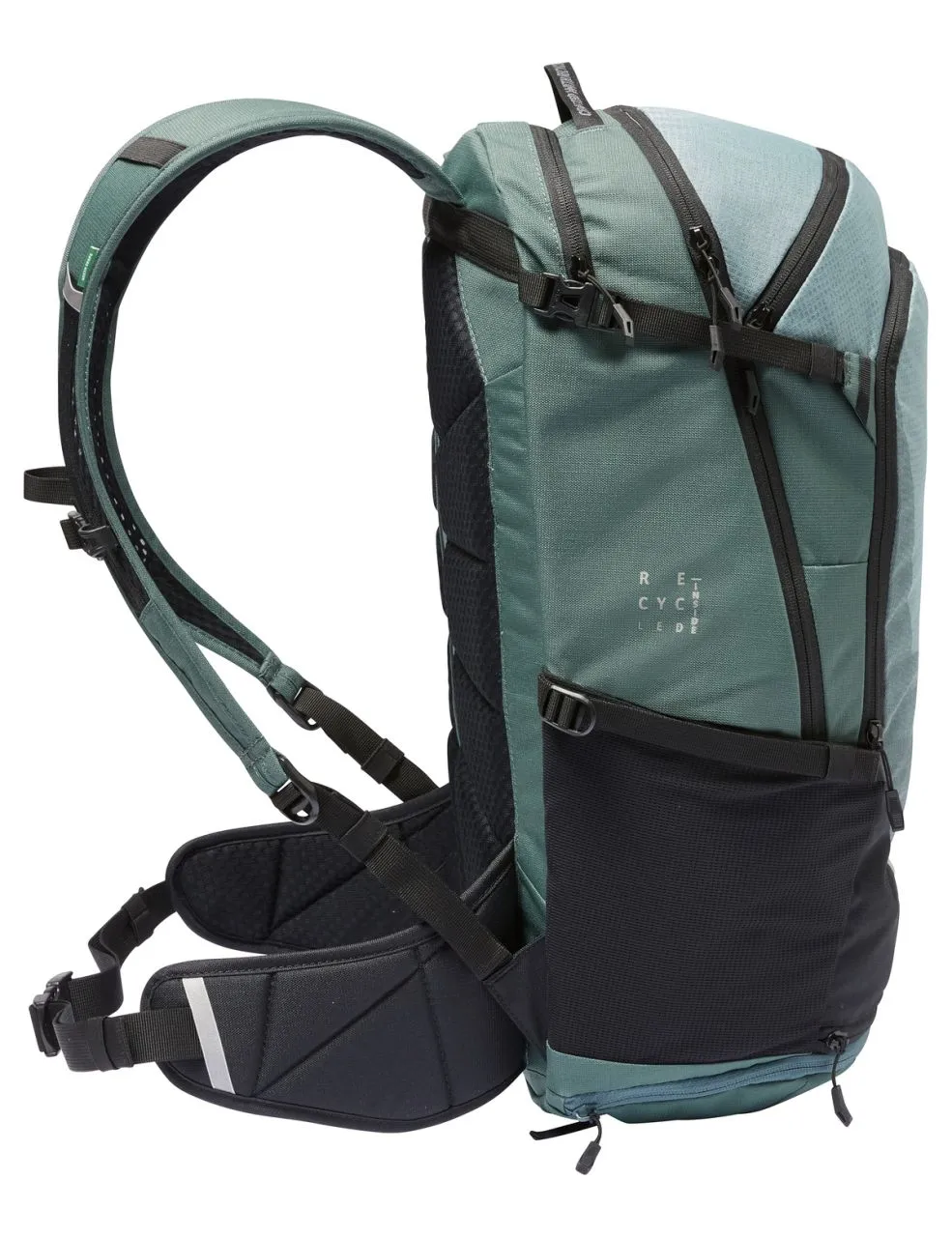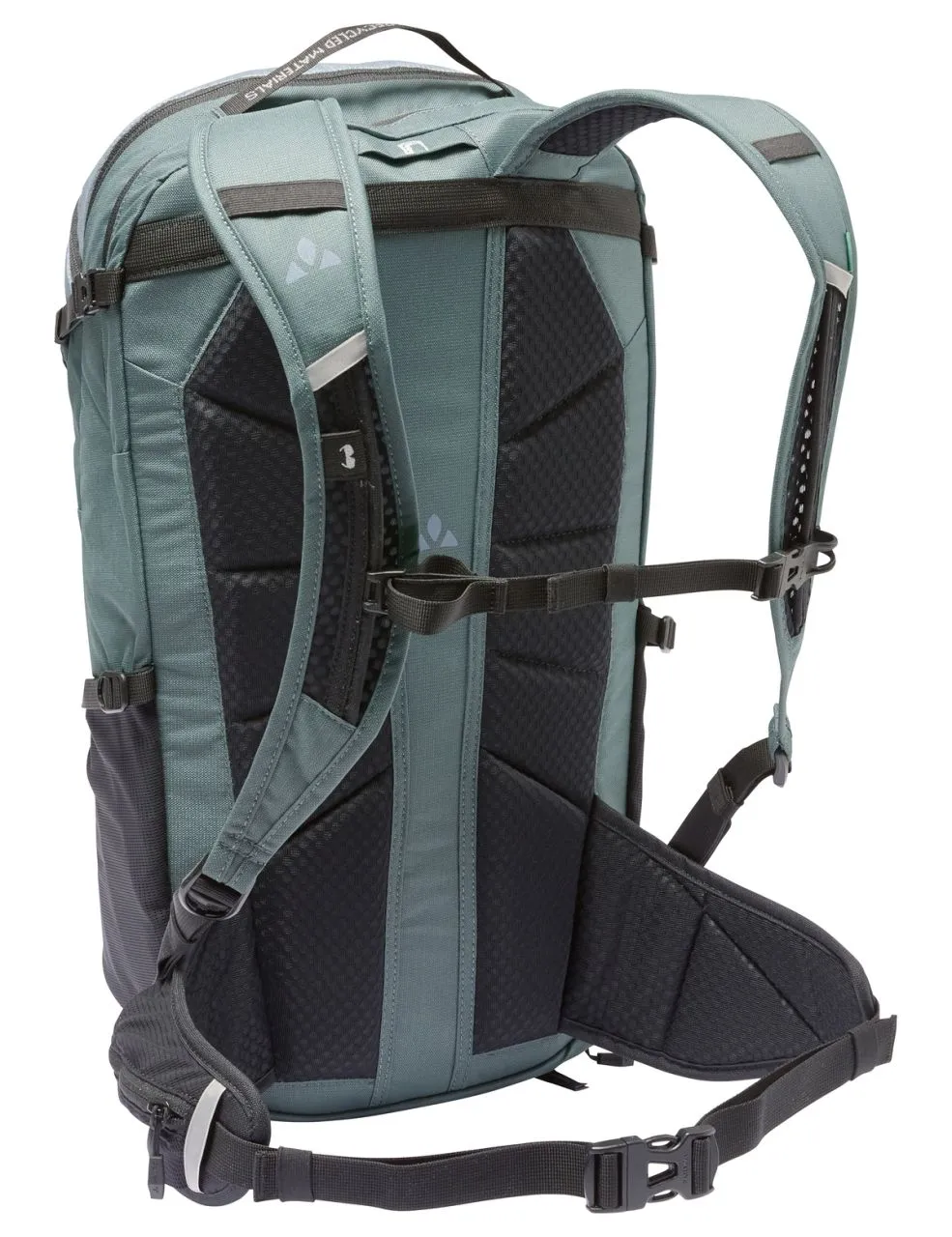 Le dernier né de notre modèle à succès Bracket Xalps résout tout problème d’organisation ! Le système dorsal Ventex Active optimisé assure un parfait maintien et une bonne ventilation au sac à dos Transalp d’une capacité de 25 l, tout en délestant sensiblement les points de pression dans la zone lombaire grâce à un rembourrage renforcé. La ceinture ventrale confortable étire le centre de gravité du sac à dos impeccablement le long du dos et assure un parfait maintien avec une liberté de mouvement optimale sur la selle en combinaison avec les bretelles Ergoshape. Le sac à dos est subdivisé en trois compartiments. Le grand compartiment principal peut être subdivisé pour mieux organiser les vêtements et les provisions et offre un accès séparé du haut ou du bas. Un compartiment supplémentaire le précède pour ranger des lunettes ou un porte-monnaie. Le compartiment outils sur l’avant du sac à dos peut loger tout ce qui doit rester à portée de main en cas de panne de manière bien organisée. Un compartiment d’insertion en-dessous permet de ranger une carte ou d’autres documents. Un compartiment se dissimule en bas du front pour ranger impeccablement la fixation de casque. Sur l’aile droite de la ceinture ventrale, une poche peut accueillir un smartphone ou une barre énergétique. Son équipement englobe des poches latérales élastiques, un compartiment spécial pour poche d’hydratation, des sangles de compression des côtés, une housse de pluie dans le fond cloisonné et des éléments réfléchissants pour améliorer la visibilité dans l’obscurité. Tous les modèles de sac à dos Moab se marient parfaitement aux tenues Moab au style imparable. Le matériau certifié bluesign® et recyclé du Moab Xalps 25 II est doté de la finition écologique et déperlante Eco Finish sans fluorocarbures (PFC).
