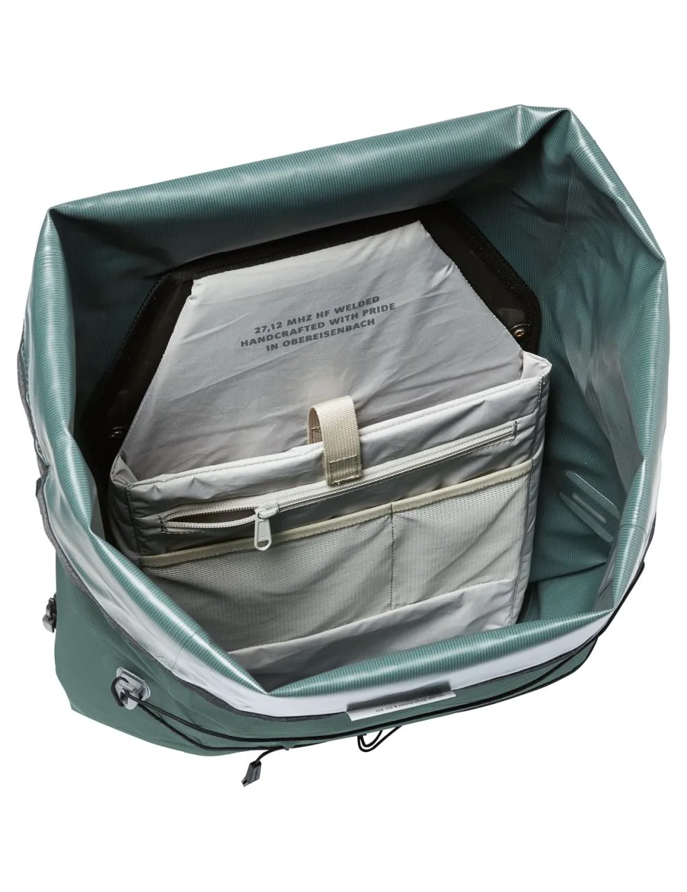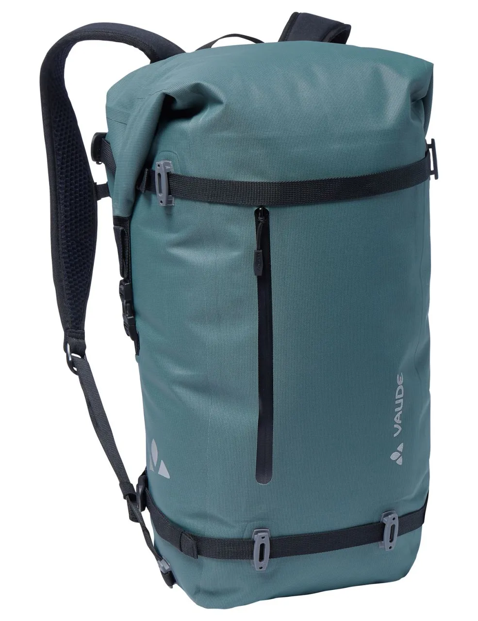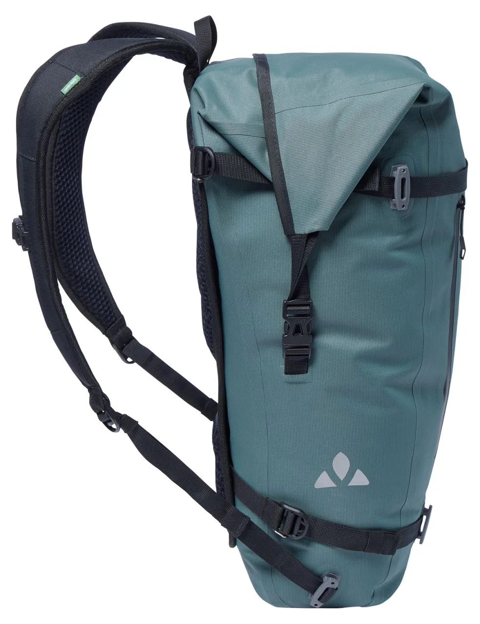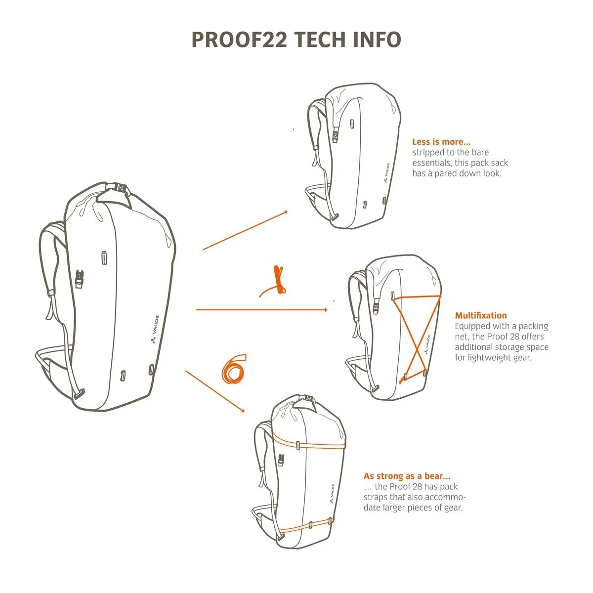 Proof – son nom annonce la couleur ! Ce sac à dos imperméable au look sobre est un véritable multitalent pour la ville, le vélo, le trail et la montagne, et ce par tous les temps ! Des bretelles Ergoshape confortables et un rembourrage dorsal placé au bon endroit permettent un maintien sûr même sans ceinture ventrale, et malgré une charge élevée ou une petite taille corporelle. Des sangles de compression en bas et en haut permettent de fixer précisément le contenu selon le litrage. La fermeture par enroulement éprouvée peut être détendue au choix vers le bas sur les côtés ou clipsée en haut, et offre un accès rapide au compartiment principal. Un compartiment rembourré pour ordinateur portable jusqu’à 13,3″ est intégré sur la partie dorsale intérieure, ainsi qu’un compartiment zippé et une pochette d’insertion pour conserver les petits accessoires. Une poche soudée de manière étanche sur l’avant peut accueillir une barre énergétique, une carte ou un GPS. Les 4 attaches multiusages soudées permettent en plus de fixer des équipements supplémentaires comme un casque, une veste ou un vêtement mouillé à l’aide du cordon compris dans la livraison. Des imprimés de logo réfléchissants sur l’avant et les côtés renforcent la visibilité dans l’obscurité. Le matériau principal extrêmement résistant à l’usure certifié bluesign® est composé à 68 % d’Econyl recyclé. Proof 22 est muni de jointures imperméables selon une technique de haute fréquence dans le respect de l’environnement au siège social en Allemagne.