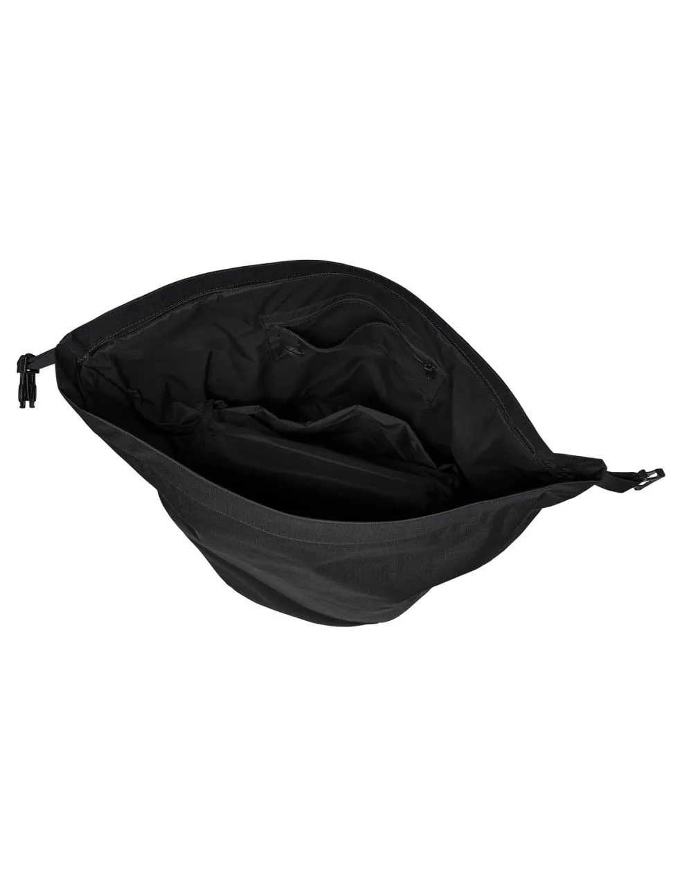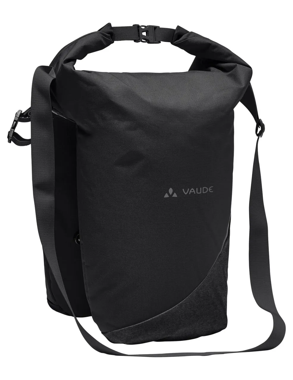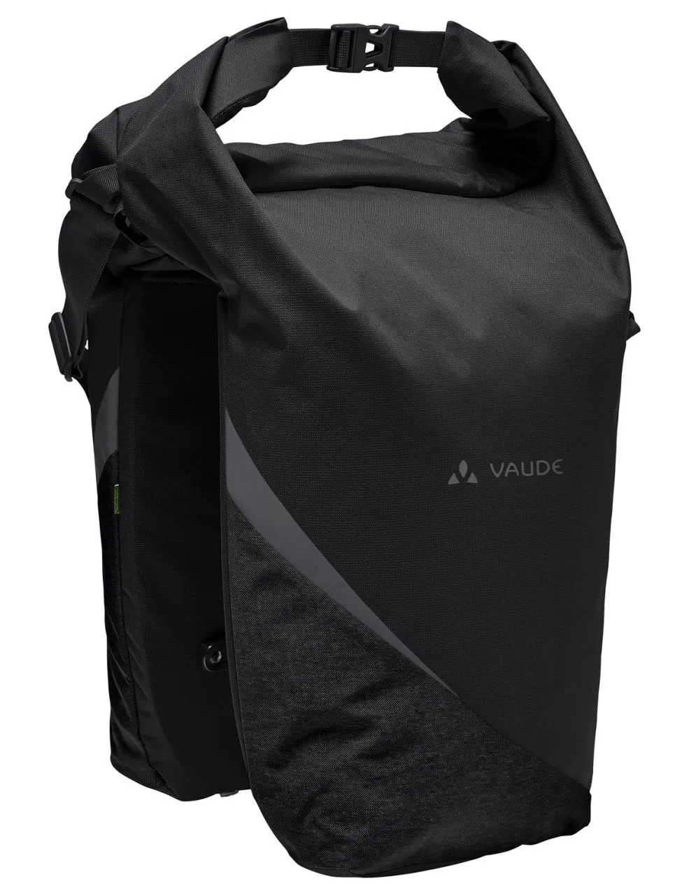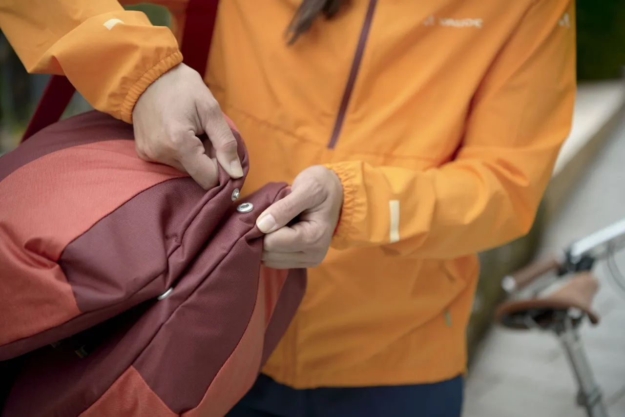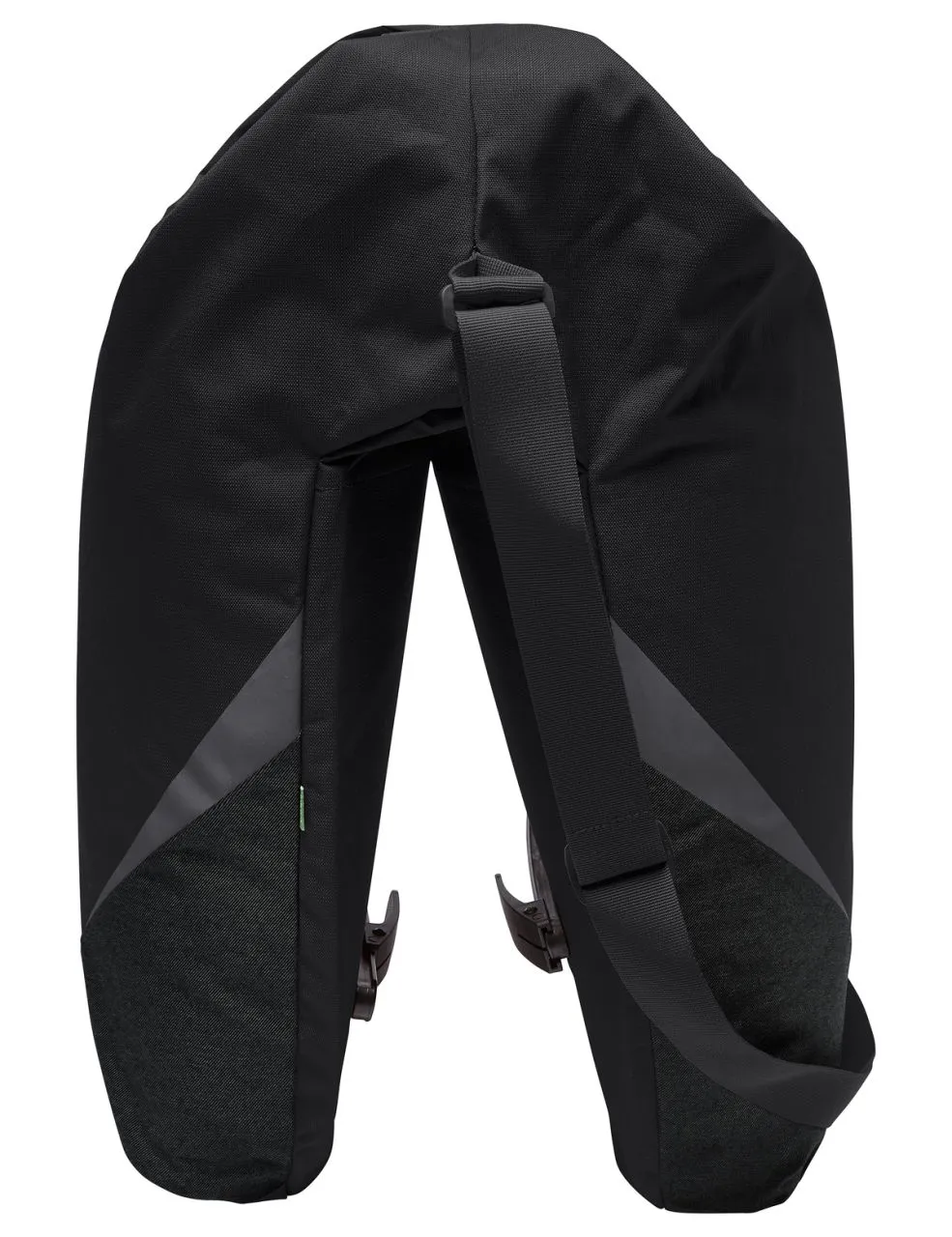 Aussi simple que génial ! Ce double organisateur de voyage ultra flexible a été imaginé par nos concepteurs de produit pour répondre aux besoins spécifiques de tous les cyclistes qui apprécient la simplicité et les choses pratiques. Une seule grande ouverture permet de vérifier le contenu d’un regard et facilite l’organisation des deux poches latérales. Sa dimension haute permet d’avaler même des baguettes ou des tubes d’emballage. Une fermeture à glissière sécurise le contenu contre le vol ou la chute. Si l’ensemble du volume n’est pas utilisé, on peut enrouler la partie supérieure et la boucler à l’aide d’une fermeture à clic, de façon à pouvoir porter l’ensemble du paquetage comme un cabas ou en bandoulière sur l’épaule avec la bretelle fixée réglable en longueur. Les deux sacoches peuvent être reliées en bas par des boutons-pression. La poche latérale gauche abrite un compartiment légèrement rembourré pour des documents au format A4 ainsi qu’un petit compartiment pour objets de valeur zippé et un porte-clés. Dans la poche latérale droite, un compartiment d’insertion spacieux permet de séparer clairement les tenues de rechange des achats. Un rail respectif muni de crochets permet de fixer les poches latérales au porte-bagages. Une sangle de couleur contrastée dotée d’une fermeture à clic fixe la sacoche en plus au support de selle. Les imprimés réfléchissants VAUDE sur les côtés comme les grands éléments réfléchissants dirigés vers l’arrière améliorent la visibilité dans la circulation. La housse de pluie comprise dans la livraison protège la sacoche comme son contenu même à pleine charge.