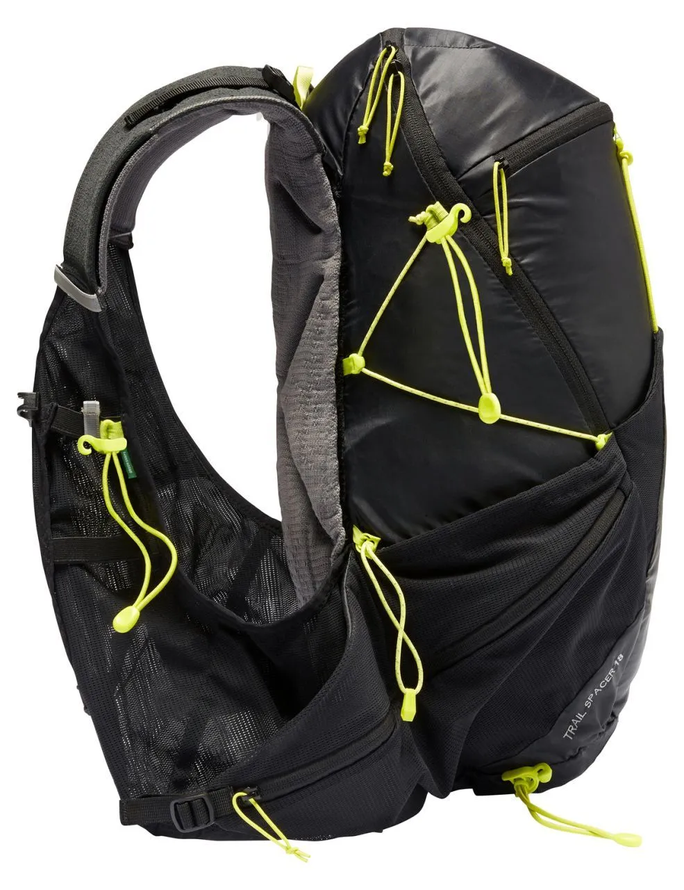 Le parfait compagnon des longues virées à toute vitesse : ce léger sac à dos multisport offre un confort maximal et une parfaite tenue grâce au dos tricoté et moulé 3D, et un espace généreux avec sa capacité 18 l pour les speed hikers, vététistes, coureurs de fond et randonneurs sportifs. La construction tricotée en 3D avec du fil recyclé écologique est une exclusivité mondiale : une répartition de la pression et une ventilation homogènes sont atteintes avec une attention particulière aux différentes zones de pression au dos. Trail Spacer 18 est muni d’un dispositif de poche d’hydratation et d’un rangement pour une virée journalière. Les bretelles sont dotées de logements pour ranger des gels, une barre énergétique ou un mobile. Deux poches latérales élastiques offrent davantage de possibilités de rangement. La poche avant peut accueillir une veste de pluie trempée et la trousse de premiers secours. Il est possible de manipuler le porte-bâtons et les sangles de compression lors du port du sac à dos. Le matériau principal en polyamide recyclé est fabriqué via une méthode du bilan massique certifiée à partir entre autres de pneus usagés recyclés. Ceci permet de réduire le CO2 jusqu’à 60 %. Grâce au tricotage en forme, la production du système dorsal ne génère aucun résidu de déchets. Le sac à dos léger est climatiquement neutre : les émissions issues des matériaux, de la fabrication et du transport ont été déterminées de manière holistique et systématiquement réduites. Les émissions actuellement inévitables sont compensées par l’organisation indépendante à but non lucratif « myclimate ». Le label Green Shape de VAUDE garantit un produit écologique, fonctionnel et fabriqué dans des matériaux durables certifiés bluesign®. Conseil : toujours nettoyer le sac à dos à la main.