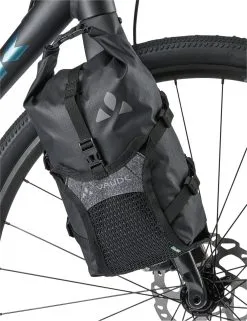 Trailmulti, c’est le nec plus ultra en matière de sacoche de vélo ! Non content d’offrir une large variété de possibilités de fixation, elle offre suffisamment d’espace pour ranger 6 litres ou 2 kilogrammes de bagages. Trailmulti est conçu pour une fixation sur des fourches présentant partout une circonférence d’au moins 9,5 cm. Le packsack imperméable avec fermeture à enroulement est inséré dans le support solide et souple à la fois avec fonction de compression et fixé à l’aide de trois sangles robustes. Une bande antidérapante sur la partie inférieure permet d’immobiliser Trailmulti pour qu’il reste bien en place. La sacoche de fourche maline n’est pas seulement un accessoire pratique pour le bikepacking. Elle apporte aussi une contribution non négligeable en matière de protection de l’environnement, car son support comme le packsack sont composés à 100 % de matériaux recyclés. Le label Green Shape de VAUDE garantit un produit écologique, fonctionnel et fabriqué dans des matériaux durables. En raison des fortes pressions exercées par les sangles sur la fourche pour la fixation, nous recommandons de ne pas utiliser ce produit sur des fourches en carbone. Compris dans la livraison : 1 pce