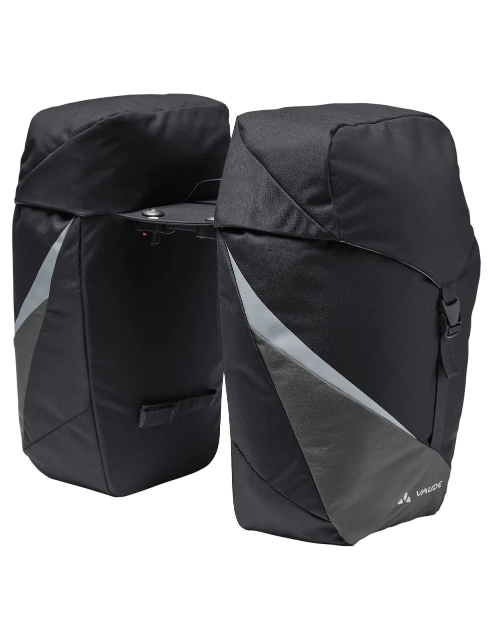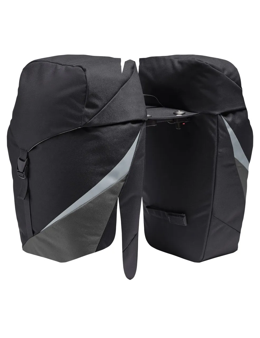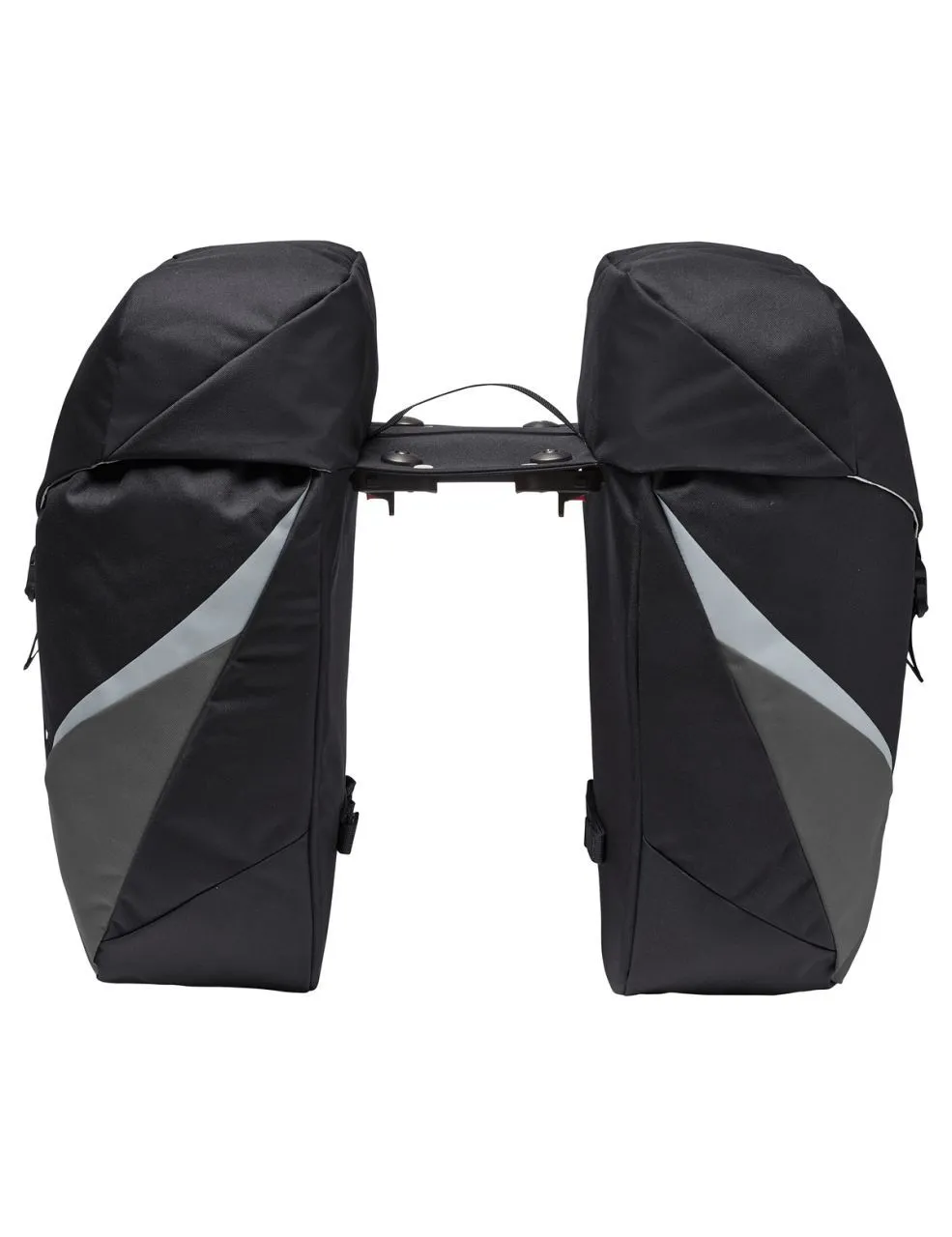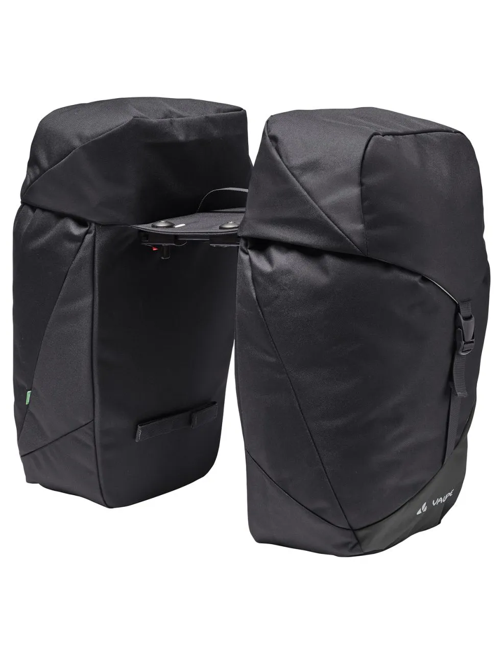 La double sacoche pour roue arrière classique d’un volume total de 52 l offre tout le nécessaire pour une journée à vélo en toute détente. La traverse qui relie les deux sacoches se pose simplement. La double sacoche de vélo est munie d’une plaque adaptatrice prémontée UniKlip 2 pour simplifier la fixation sur le porte-bagages. Les sacoches sont fermées par un capot ; le soufflet d’élargissement en-dessous permet de comprimer le contenu. Des éléments réfléchissants élégamment intégrés au design et les housses de pluie fournies complètent les prestations de cette double sacoche pour roue arrière pratique en polyester 100 % recyclé. Le label Green Shape de VAUDE garantit un produit écologique, fonctionnel et fabriqué dans des matériaux durables certifiés bluesign®. En tant que membre Leader de l’organisme indépendant Fair Wear, VAUDE s’engage en faveur de conditions de travail et de salaires équitables. Ce produit est de plus climatiquement neutre : les émissions issues des matériaux, de la fabrication et du transport ont été déterminées de manière holistique et systématiquement réduites. Les émissions actuellement inévitables sont compensées par l’organisation indépendante à but non lucratif « myclimate ».
