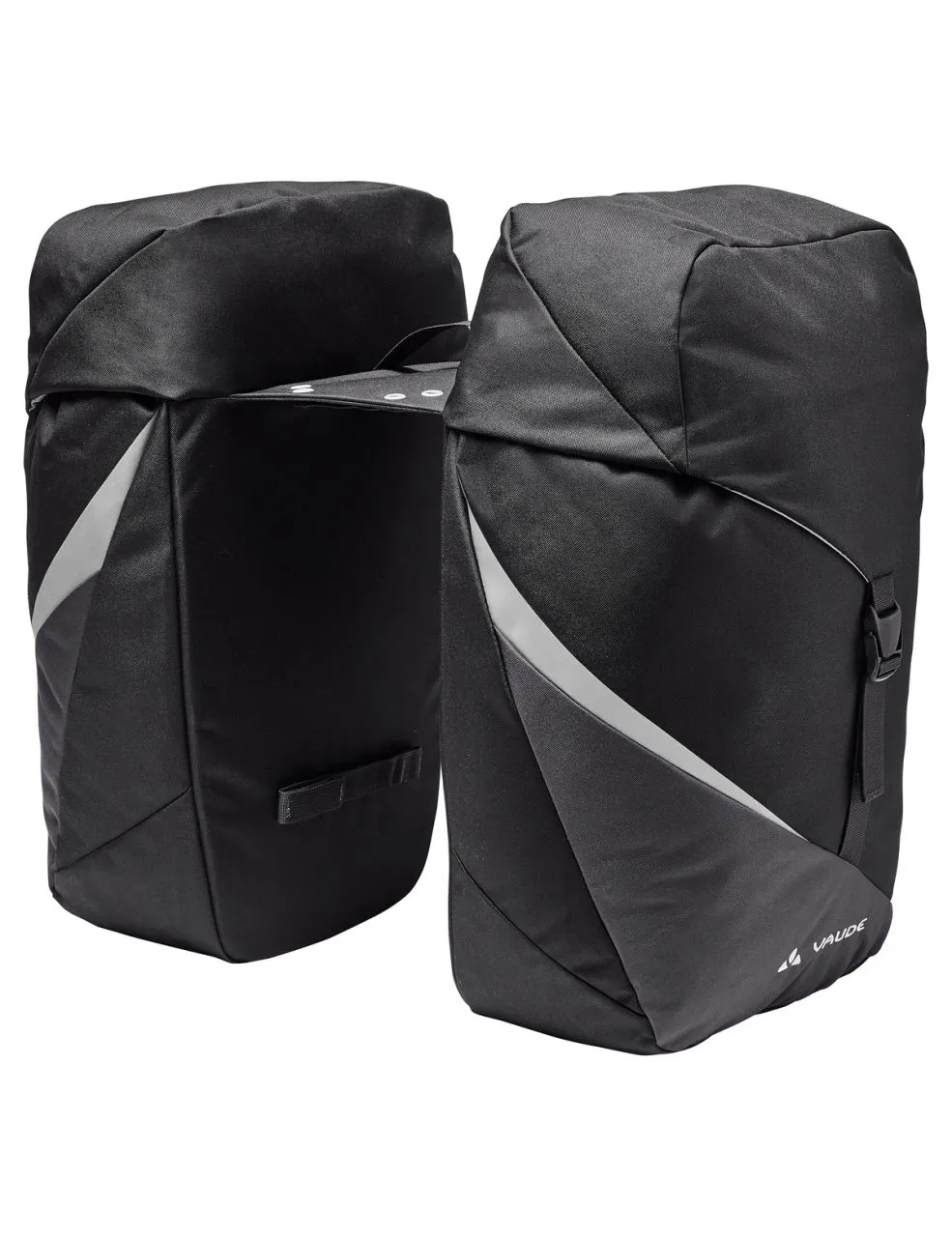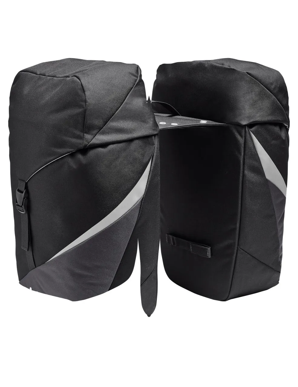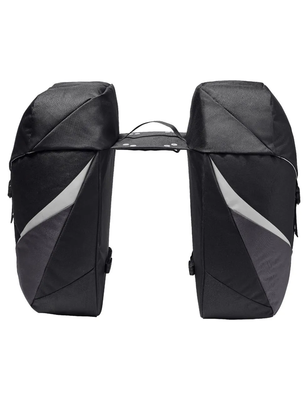 La double sacoche pour roue arrière classique d’un volume total de 52 l transporte tout le nécessaire pour une journée à vélo en toute détente. La pose et le retrait s’effectuent en quelques gestes. Les deux sacoches sont reliées par une traverse qui est simplement posée et fixée sur le porte-bagages en haut et sur le côté par des bandes velcro. Ses 4 œillets intégrés permettent d’équiper ultérieurement les sacoches par un système de fixation courant (Uniklip, MIK, Snap-it, Snap-it II, I-Rack). Les sacoches sont fermées par un capot ; le soufflet d’élargissement en-dessous permet de comprimer le contenu. Des éléments réfléchissants élégamment intégrés au design et les housses de pluie fournies complètent les prestations de cette double sacoche pour roue arrière pratique en polyester 100 % recyclé. Le label Green Shape de VAUDE garantit un produit écologique, fonctionnel et fabriqué dans des matériaux durables certifiés bluesign®. En tant que membre Leader de l’organisme indépendant Fair Wear, VAUDE s’engage en faveur de conditions de travail et de salaires équitables. Ce produit est de plus climatiquement neutre : les émissions issues des matériaux, de la fabrication et du transport ont été déterminées de manière holistique et systématiquement réduites. Les émissions actuellement inévitables sont compensées par l’organisation indépendante à but non lucratif « myclimate ».