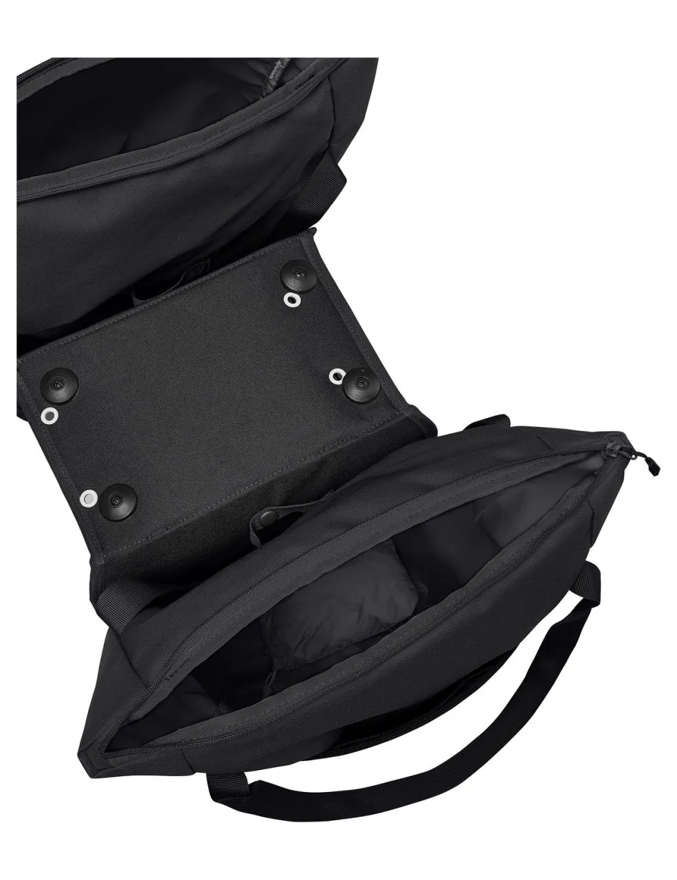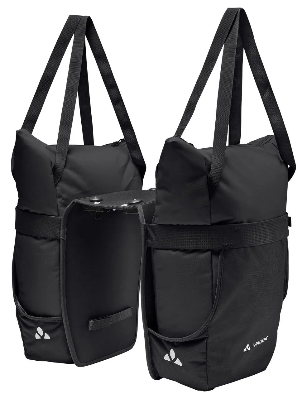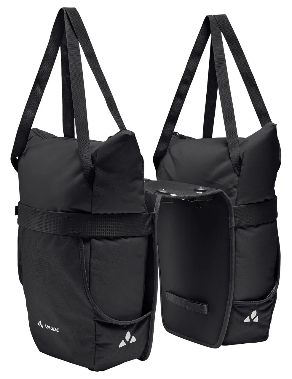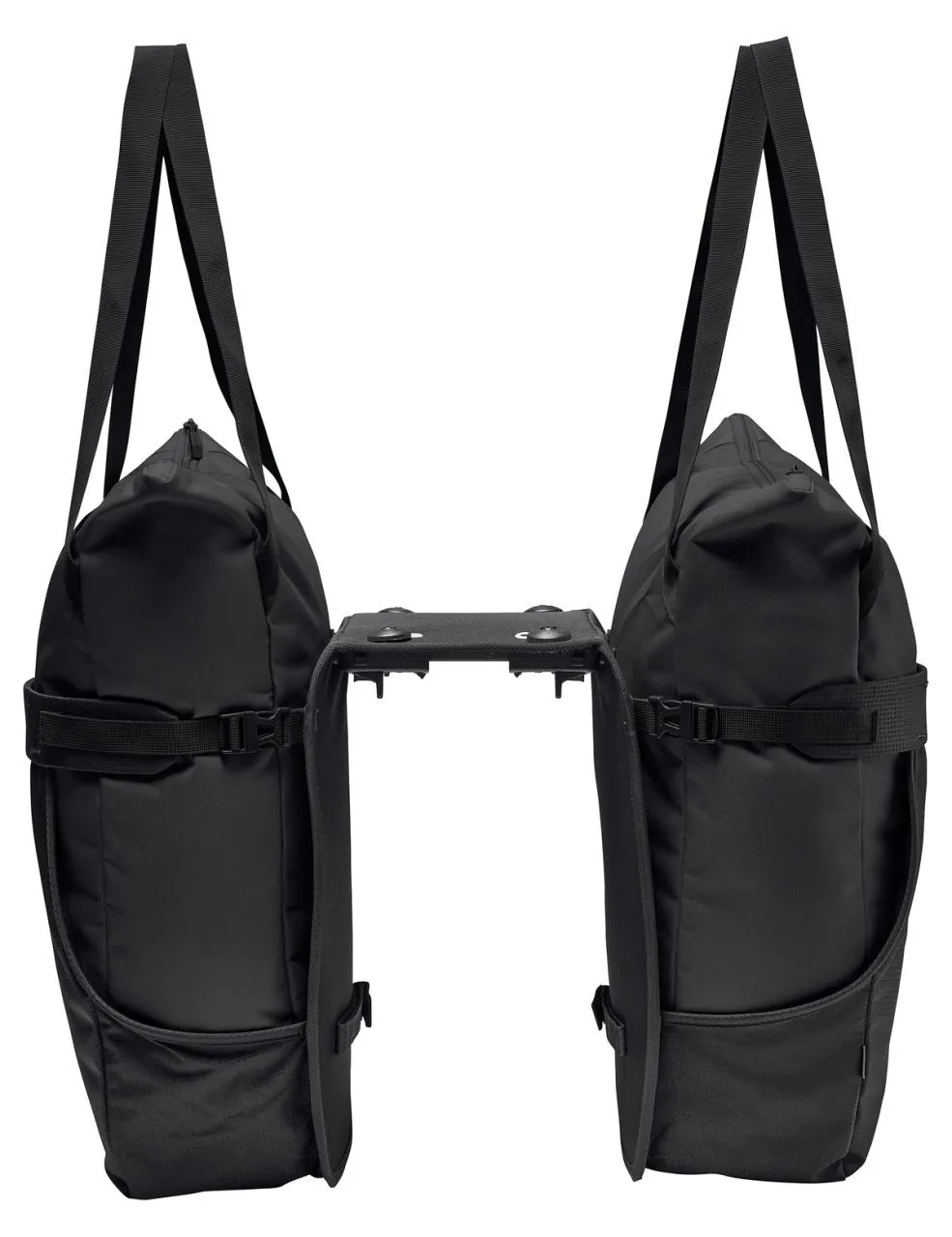 L’innovation alliée à un design moderne : la sacoche de vélo double TwinShopper convient non seulement pour les emplettes, mais aussi pour la salle de sport. L’atout particulier de la sacoche de vélo est la possibilité de retirer les sacs individuels des étuis fixés sur le vélo pour le shopping ou le sport. De plus, fixer et retirer TwinShopper du vélo est simple et rapide. Car il suffit de poser simplement la traverse qui relie les deux étuis sur le porte-bagages. La double sacoche de vélo est munie d’une plaque adaptatrice prémontée UniKlip 2 pour simplifier la fixation sur le porte-bagages. Les sacoches amovibles se ferment avec un zip et 2 longues sangles permettent de les transporter sur l’épaule. En cas de chargement lourd ou volumineux, on peut ouvrir les étuis pour les charger de côté et les comprimer par un cordon. Les sacoches sont fixées de plus en haut par un bouton-pression sur l’étui. Des éléments réfléchissants et les housses de pluie fournies avec les sacoches doubles de vélo composées à 100 % de polyester recyclé assurent une meilleure visibilité au crépuscule et par mauvais temps. Le label Green Shape de VAUDE garantit un produit écologique, fonctionnel et fabriqué dans des matériaux durables certifiés bluesign®. En tant que membre Leader de l’organisme indépendant Fair Wear, VAUDE s’engage en faveur de conditions de travail et de salaires équitables. Ce produit est de plus climatiquement neutre : les émissions issues des matériaux, de la fabrication et du transport ont été déterminées de manière holistique et systématiquement réduites. Les émissions actuellement inévitables sont compensées par l’organisation indépendante à but non lucratif « myclimate ».