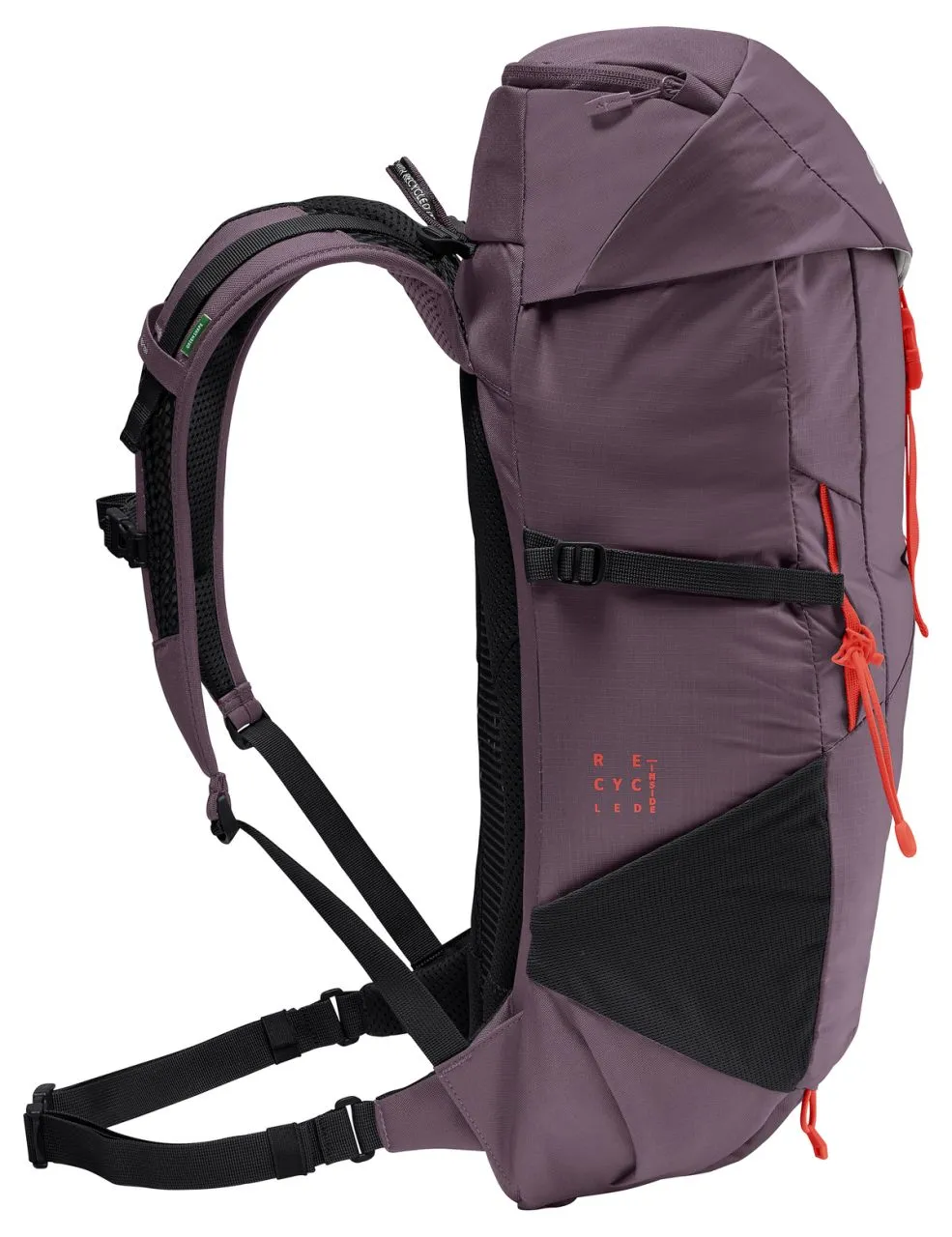 Petit sac à dos de randonnée moderne pour femme – les bretelles et les stabilisateurs de Neyland 18 sont spécialement adaptés à l’anatomie féminine. Le système dorsal innovant avec modules de mousse structurée derrière le filet assure d’une part une bonne aération et un contact stable sur le dos d’autre part, afin de permettre au sac à dos avec chargement par le haut de reposer uniformément sur le dos malgré la ventilation. La plaque EMP (ergonomic movement panel) intégrée soutient la flexion naturelle du dos en montée et stoppe la pression des bagages sur le dos dans le même temps. Le petit sac à dos de randonnée pour femme est muni d’un rabat avec compartiment, d’un compartiment principal spacieux, d’un logement séparé pour système d’hydratation et d’un logement avec housse de pluie. Les poches latérales élastiques permettent de ranger une boisson, un bonnet, des gants ou d’autres petites affaires. Un porte-bâtons et les sangles de compression latérales permettent de fixer des bâtons de randonnée et d’autres bagages. Women’s Neyland 18 est fabriqué en matériau principalement recyclé et climatiquement neutre de surcroit : les émissions issues des matériaux, de la fabrication et du transport ont été déterminées de manière holistique et systématiquement réduites. Les émissions actuellement inévitables sont compensées par l’organisation indépendante à but non lucratif « myclimate ». Le label Green Shape de VAUDE garantit un produit écologique, fonctionnel et fabriqué dans des matériaux durables certifiés bluesign®.